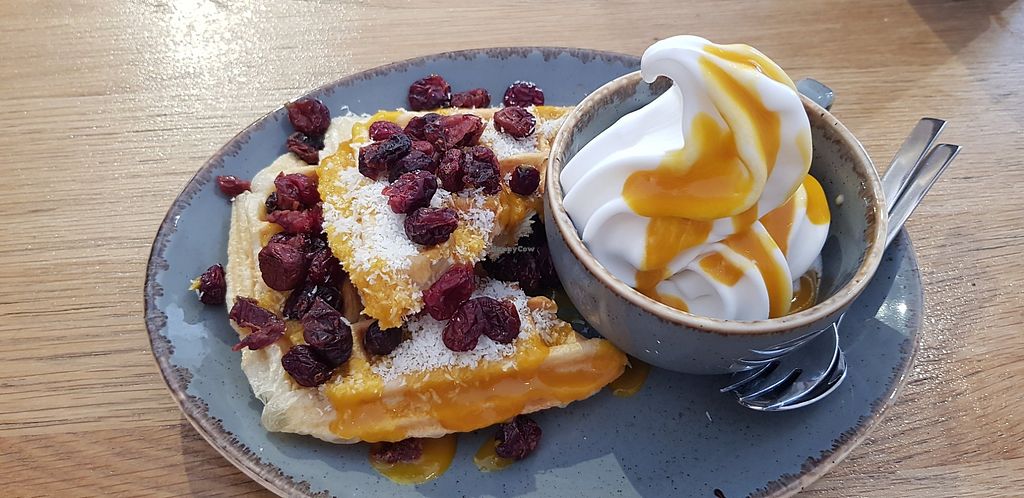 Der Frozen Yoghurt ist standardmäßig vegan und fast alle Saucen und Toppings ebenfalls. Wir haben uns letztens die Croissant Waffeln schmecken lassen. Einmal Schwarzwälder Kirsch mit Schokosauce, Kirschen, Schokoraspeln und Froyo. Und einmal Tropical mit Mangosauce, Kokosraspeln, Cranberries und Froyo. Super lecker.