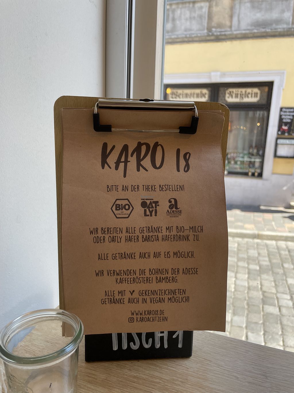 KARO18 is a café located in the heart of Bamberg. They offer frozen joghurt and more. I tried the vegan frozen joghurt. It's vegan by default, just the toppings can be vegan or non-vegan. It's clearly labeled, which toppings are vegan. They also offer coffee with oat or soy milk. Sadly, they also have cow milk. KARO18 also has vegan waffles on their menu - I didn't tried them tho. As far as I can remember, the vegan frozen joghurt was quite creamy and very delicious. To my surprise, the frozen joghurt was made out of some sort of rice. It was very refreshing. You can choose the size of the frozen joghurt. There are different sauces aswell beside the toppings. The interior was great and you could sit inside. The frozen joghurt can be ordered for takeaway. KARO 18 also has a small shop inside of the café. Overall, I can recommend visiting this place, If you're in Bamberg.