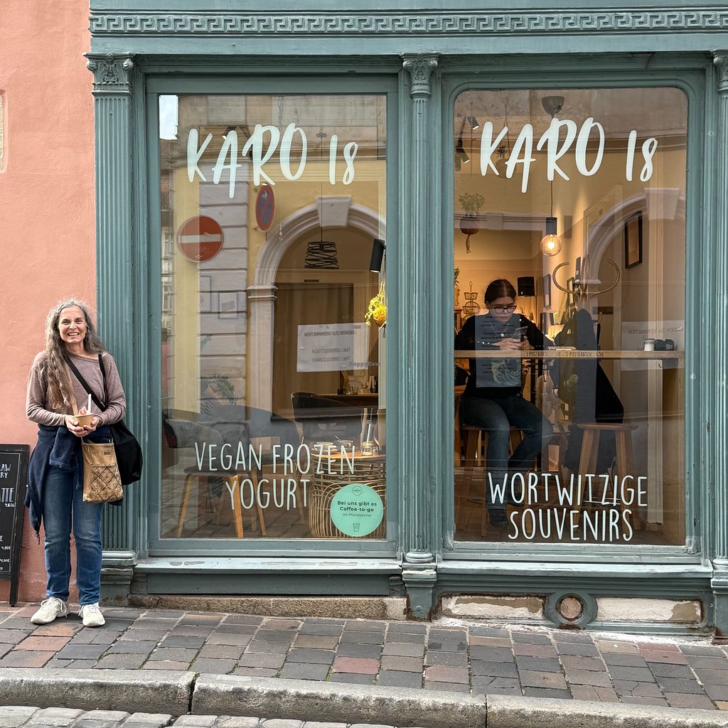 Das KARO18 ist ein Café im Herzen von Bamberg. Hier gibts Frozen Joghurt und mehr. Ich habe den veganen Frozen Joghurt probiert. Dieser ist von der Basis her vegan, nur die Toppings können vegan oder nicht-vegan sein. Glücklicherweise ist deutlich beschriftet, welche Toppings vegan sind. Das Café bietet auch Kaffee mit Hafer- oder Sojamilch an. Leider gibt es dort auch Kuhmilch. KARO18 hat auch vegane Waffeln im Angebot - ich habe sie aber nicht probiert. Soweit ich mich erinnern kann, war der vegane Frozen Joghurt recht cremig und sehr lecker. Zu meiner Überraschung wurde der Frozen Joghurt aus Reis hergestellt. Im Sommer sehr erfrischend. Man kann die Größe des Frozen Joghurts wählen, also zwischen klein und groß. Neben den Toppings gibt es auch noch verschiedene Soßen. Der Innenraum war toll und man konnte drinnen sitzen. Den gefrorenen Joghurt kann man auch zum Mitnehmen bestellen. KARO 18 hat auch einen kleinen Laden innerhalb des Cafés. Insgesamt kann ich diese Location sehr empfehlen für einen kurzen Zwischenstopp, wenn man in Bamberg unterwegs ist.