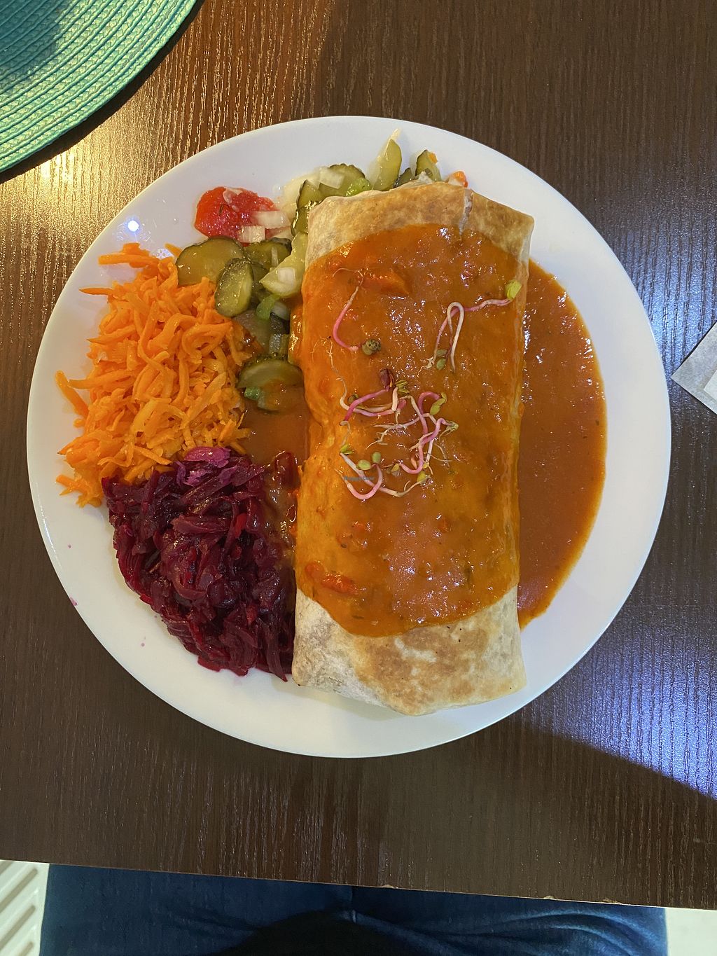 While the restaurant is marked as vegetarian, most dishes are in fact vegan. I like the home-made feel to it. The tables are roomy and plenty of space to sit. I got the vegan burrito and it was so filling I had a hard time finishing it! It was a tad on the salty side but delicious. Definitely worth coming back as the menu changes.