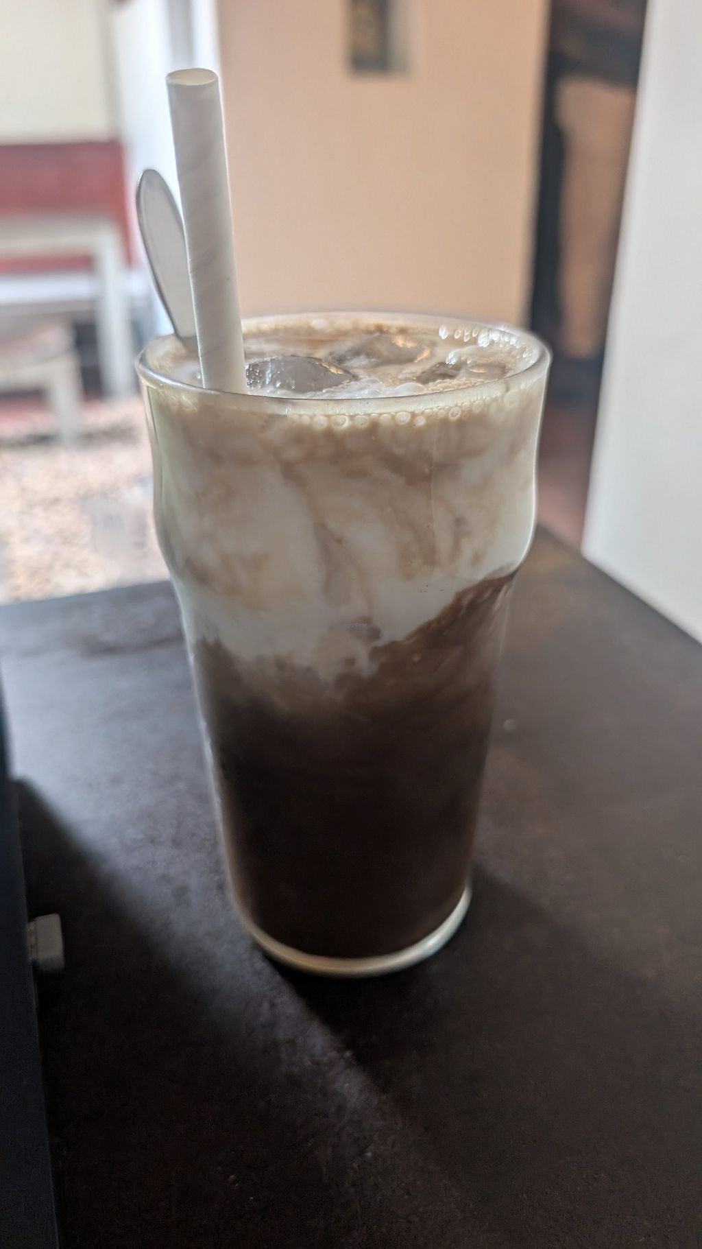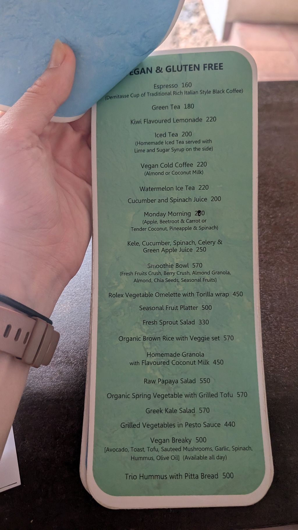 The cafe has wifi and doesn't mind if you hang out and work for a while. There's a separate vegan menu, prices are high for Kerala but the food looked nice. I had the cold coffee with coconut milk - I'd definitely recommend to have it with almond milk. The coconut milk was good for the first few sips but it's so incredibly heavy, it made me feel pretty icky. Think drinking a can of coconut milk - it's intense 😅 The coffee was pint sized which was fun!