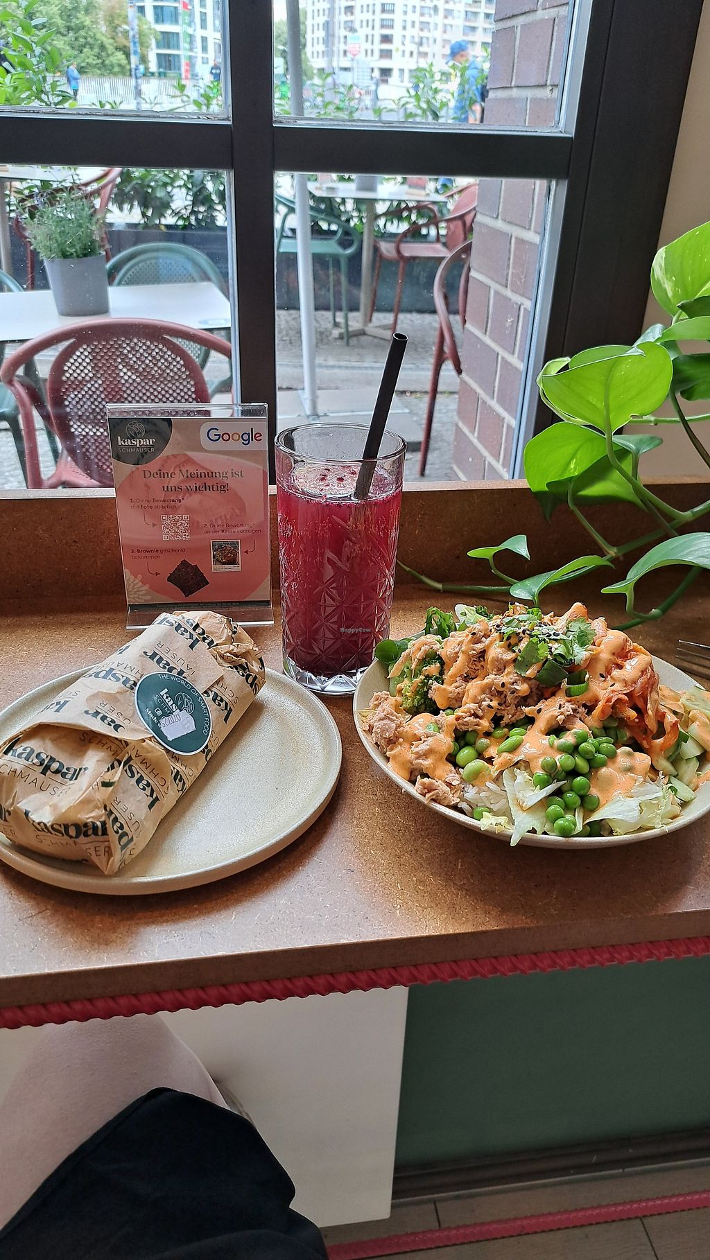 Sehr schöne Einrichtung, nettes Personal, Bestellung per Terminal möglich. Sehr farbenfrohes Essen, viele Kombinationen an Gemüse Soßen und Extras möglich. Leider direkt an der Bahn und heute mit Baustellenlärm. Immer wieder gerne.