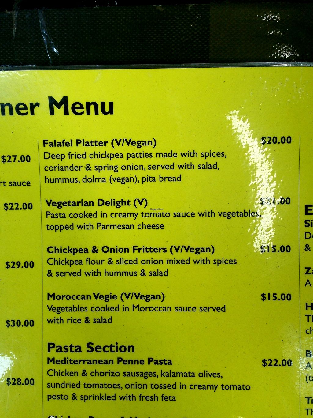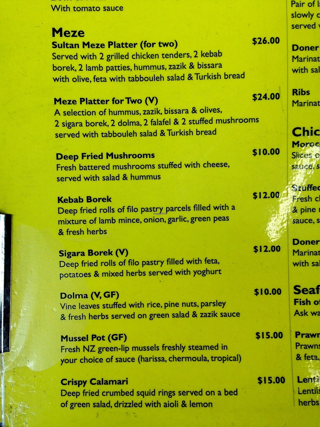 We strated with a meze platter for two wich was a vegetarian dish. For two people it was so reasonable just 24nzd. As main we shared the falafel platter the chickpea stew just between 20-15 nzd. So cheep. Tast was amazing. Thanks for the cheff.