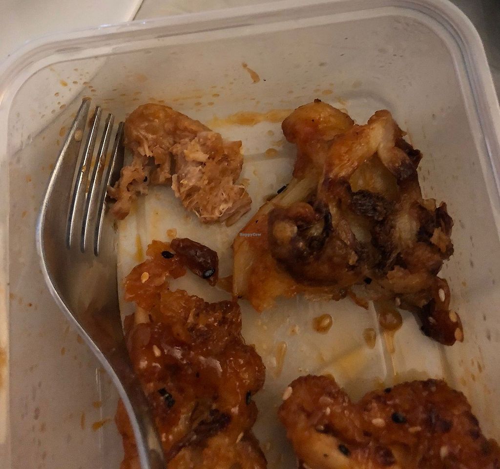 Pedaço de carne encontrado no prato vegano de couve flor empanada, esp…