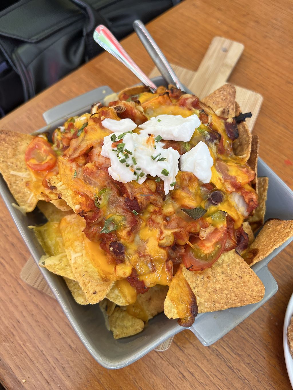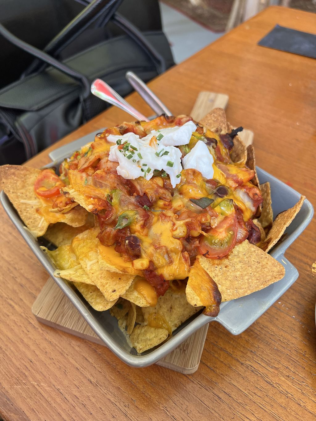 Vegan nachos with pulled jackfruit, cheddar, tomatoes and spring onion…