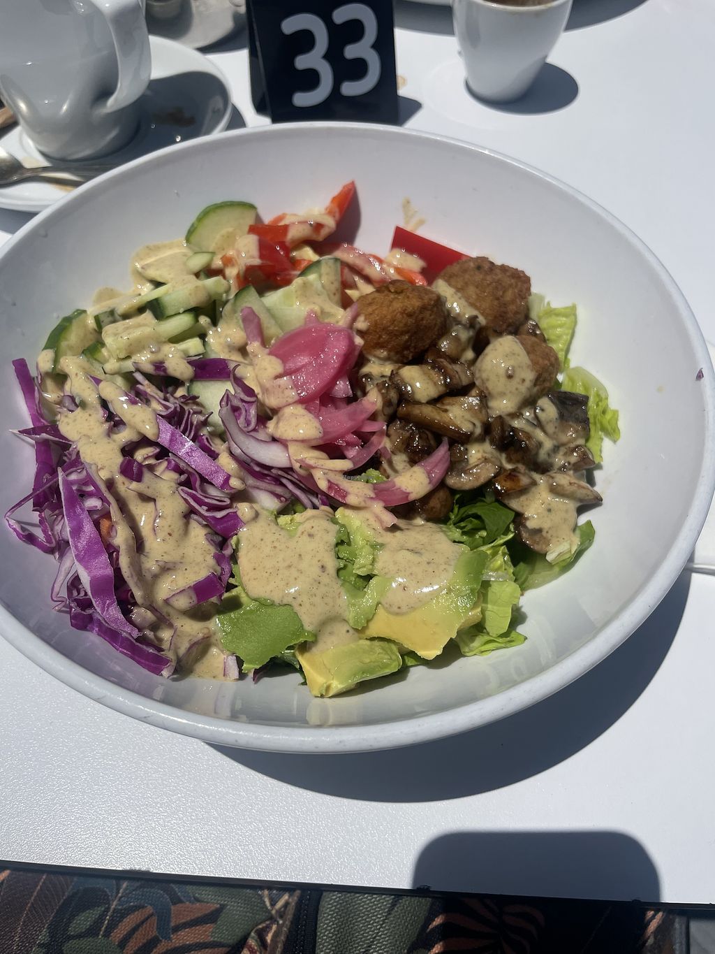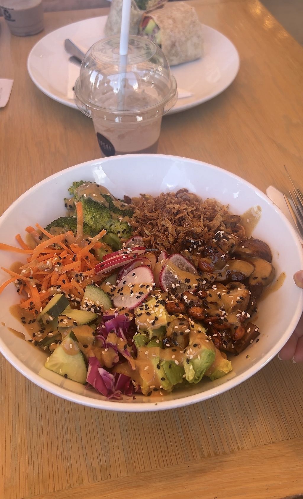 We had the Vegne wrap and a vegan mushroom bowl here & some smoothies. Everything was delicious but they don’t really have a protein source in the vegan options. The smoothies are very delicious and they’ve got two vegan protein smoothie options. 😊