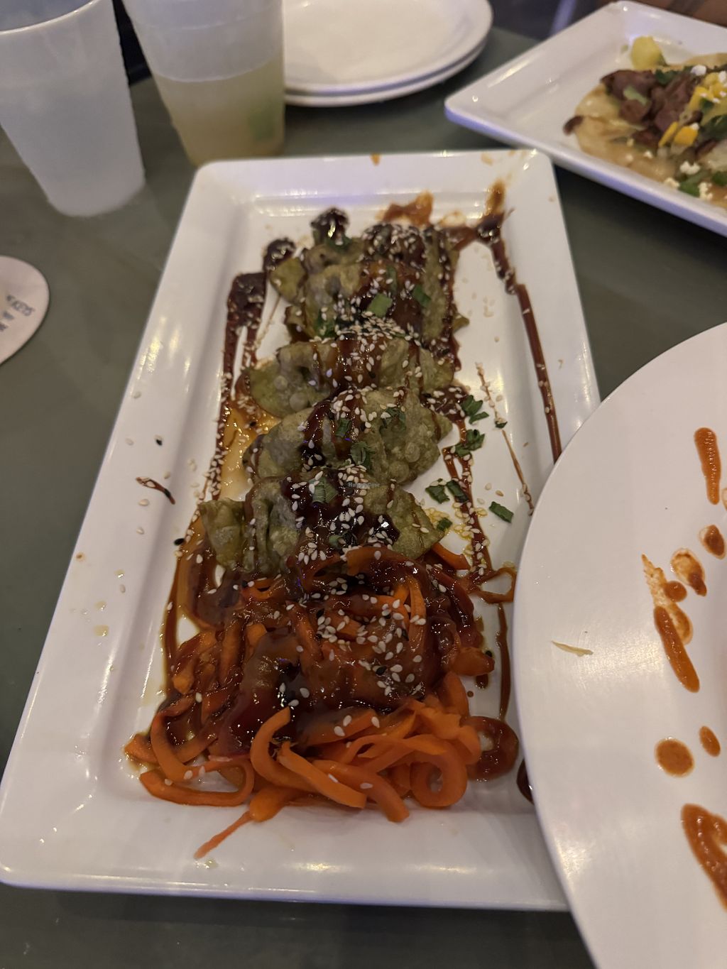 We had the blackened shrimp tacos subbed with blackened tofu. The chimichurri sauce is also vegan along with the pineapple slaw. Amazing meal!