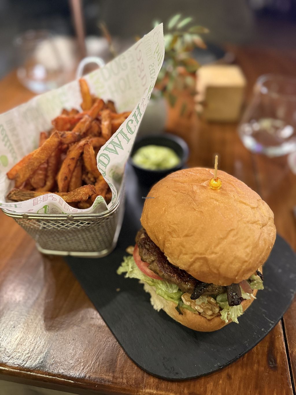 Nice to see they came up with their own vegan burger option featuring mushrooms which could be more tasty, walnuts which is a first on a burger though kind of works. The sweet potato fries and guacamole (instead of ketchup) were actually better tasting than the burger. Not sure I'd get it again. Also, they "don’t have tap water" which is weird.