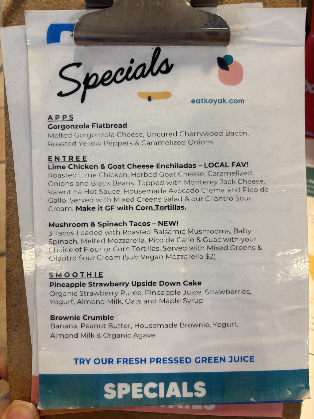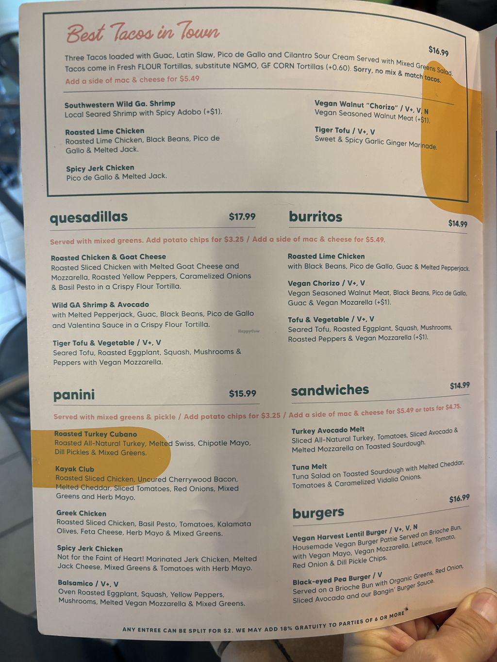 A great meal. Clearly labeled vegan options — soups, salads, sandwiches, tacos, quesadillas, etc. Also juices, smoothies, & lemonades. Everything we ordered was delicious. Service was great.