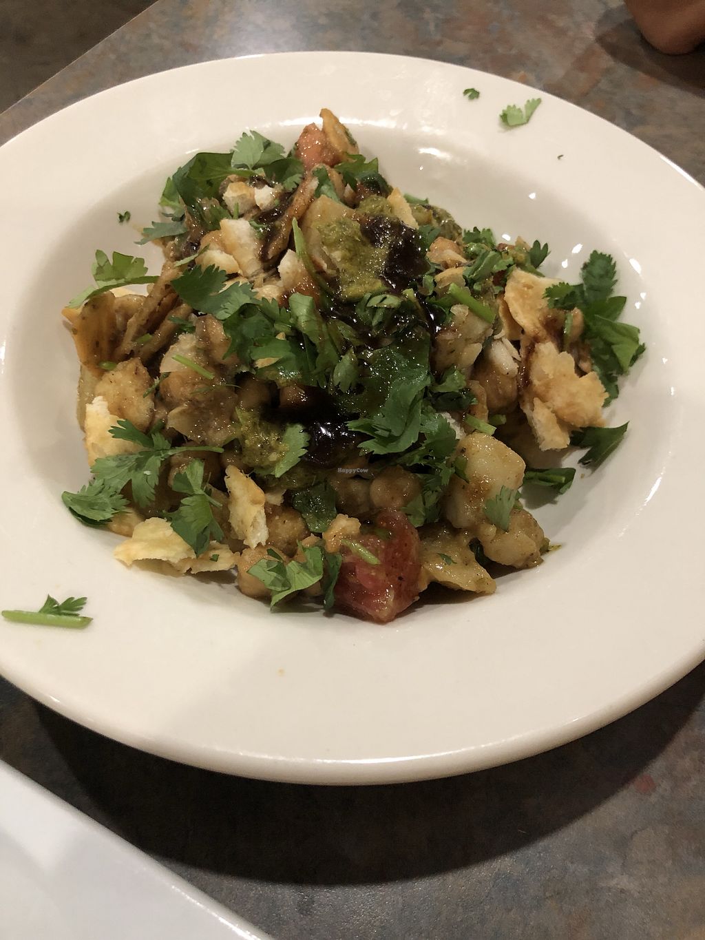 Salad with chickpeas, potatoes, mint and tamarind chutney.