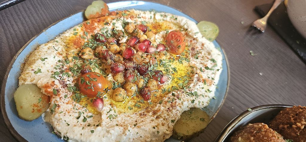 Turkish place servers Humus and falafel. the best Humus I ate in Heidelberg so far! friendly waiter small place. the salad dressing was too excessive - better ask for it on the side..