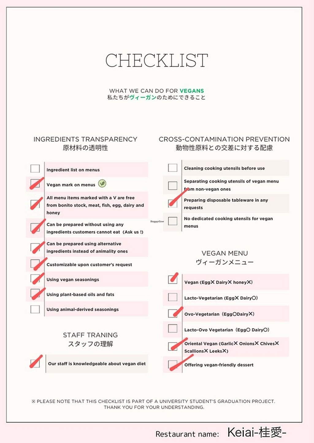Keiai has a clear checklist of what can be done for vegans. The staff …