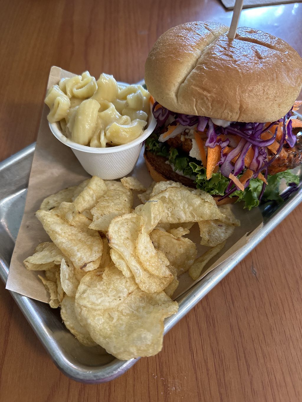 I had the bbq jackfruit sandwich with the Mac and cheese side. Food came quickly, was very flavorful and quite filling. My meal came with potato chips but I asked to have meal without as it was too much food otherwise for me.