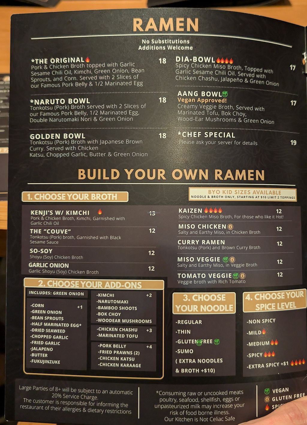 Menu items marked vegan (like the Aang bowl) need to be specified to have the gluten free noodles to be vegan despite being marked as such. Food is excellent though.