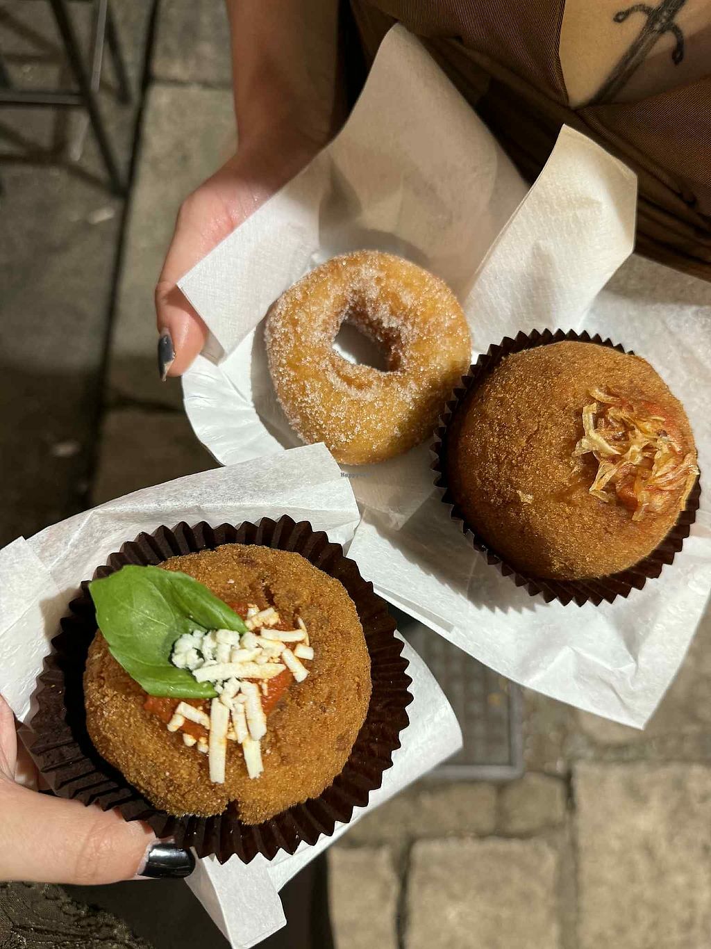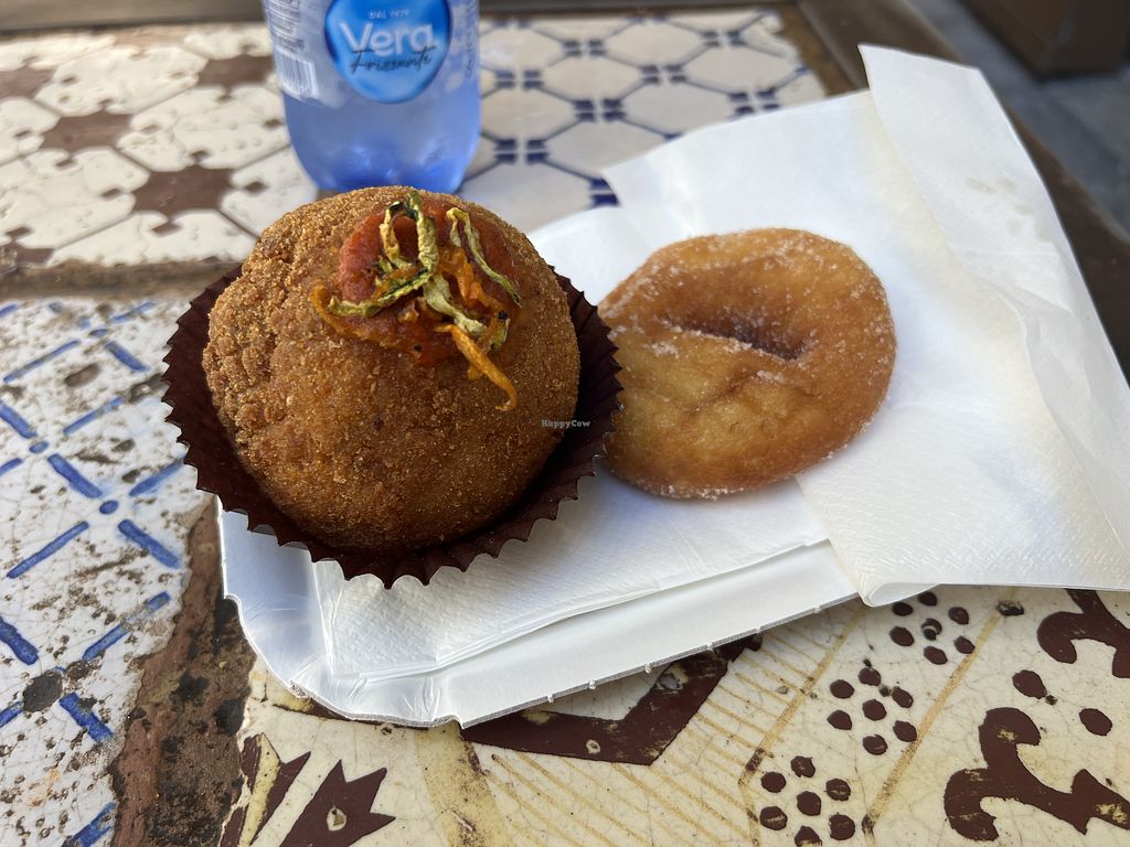 It was delicious. Very flavorful arancini. Cleared labeled vegan items. Donut was plain sugared donut. They also had the typical fried chickpea potato croquette