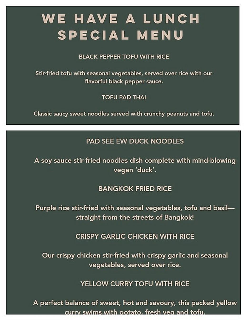 Vegan Thai restaurant offering spring rolls, salads, satay tofu, grilled vegan duck, noodles, curries, stir fry, desserts and more. Open Mon-Sat 12:00pm-2:00pm, Mon-Thu 5:00pm-9:00pm, Fri-Sat 5:00pm-10:00pm, Sun 12:00pm-3:00pm.