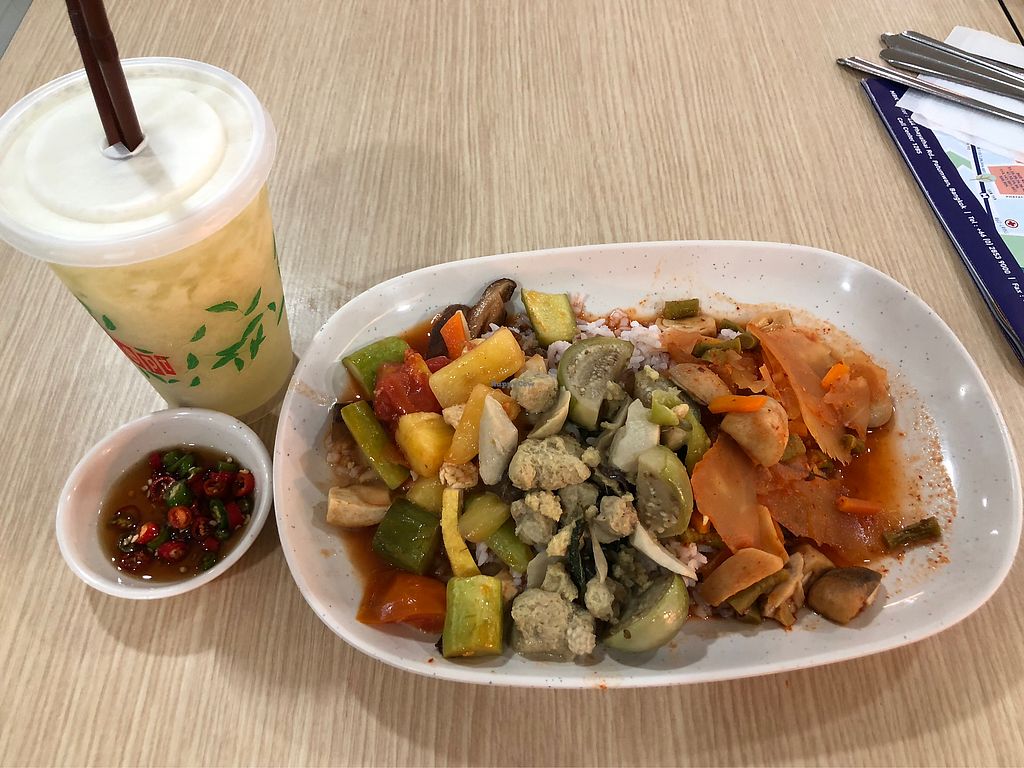 Part of vegetarian restaurant group, this is a food stall at Central World 7th floor. A variety of rice and noodle Thai dishes as well as salads and soup. Confirmed closed, November 2018.