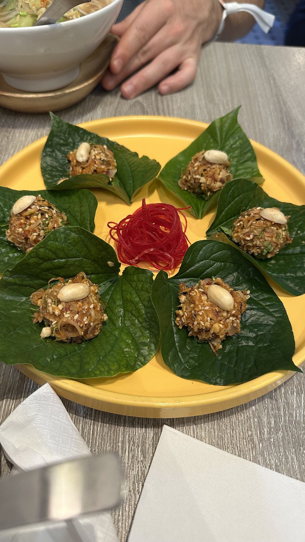 Fried roti with green curry, 118 baht