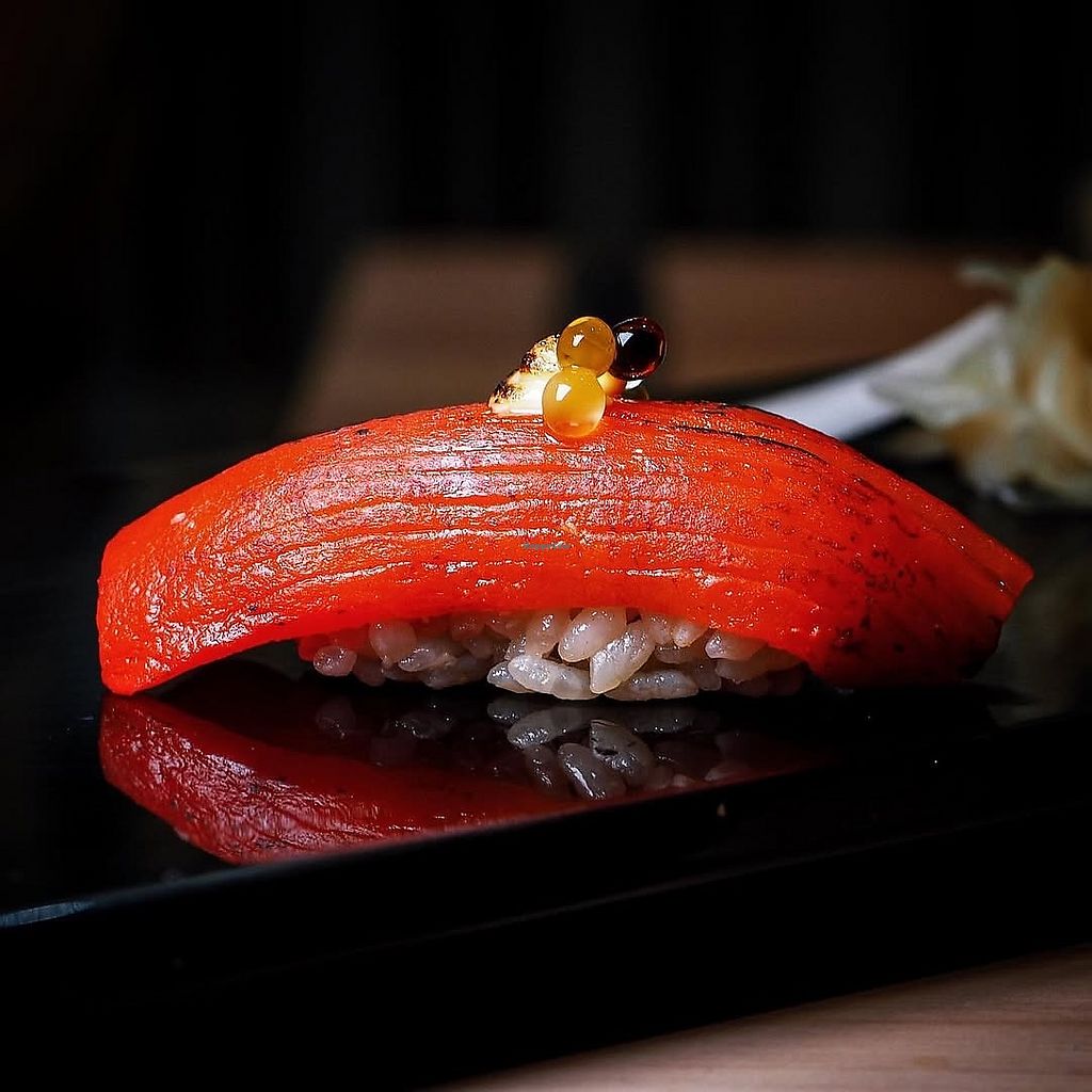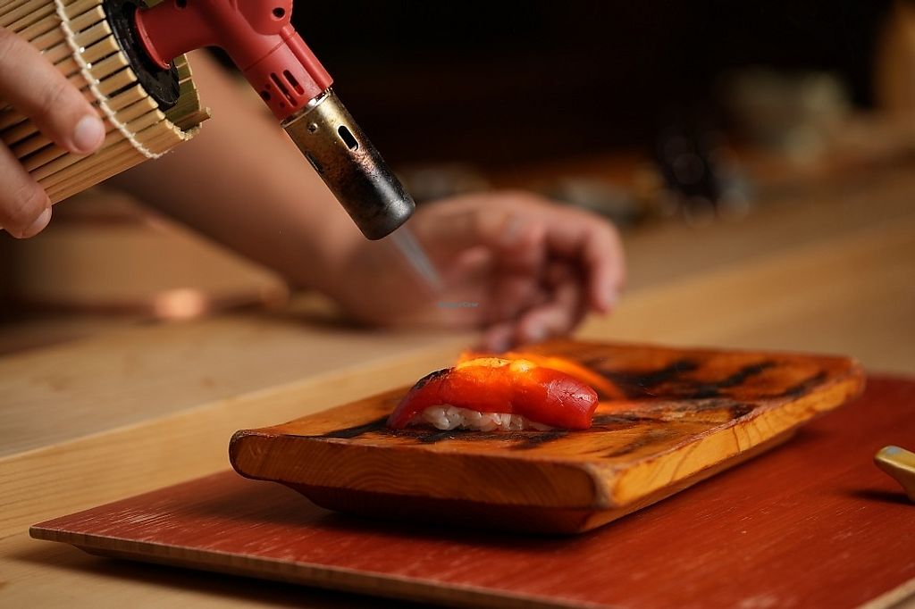 A vegetarian restaurant offering omakase. Offers a vegan set lunch or dinner. Vegan omakase may include appetizer, nigiri sushi, truffle pâté, yakimono, golden temaki, entrée, soup & dessert. Reservations recommended via website or telephone. Open Mon-Sat 12:00pm-3:00pm, 6:00pm-10:00pm. Closed Sun.