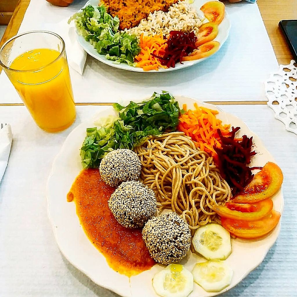 Meatless balls with all grain pasta and salad