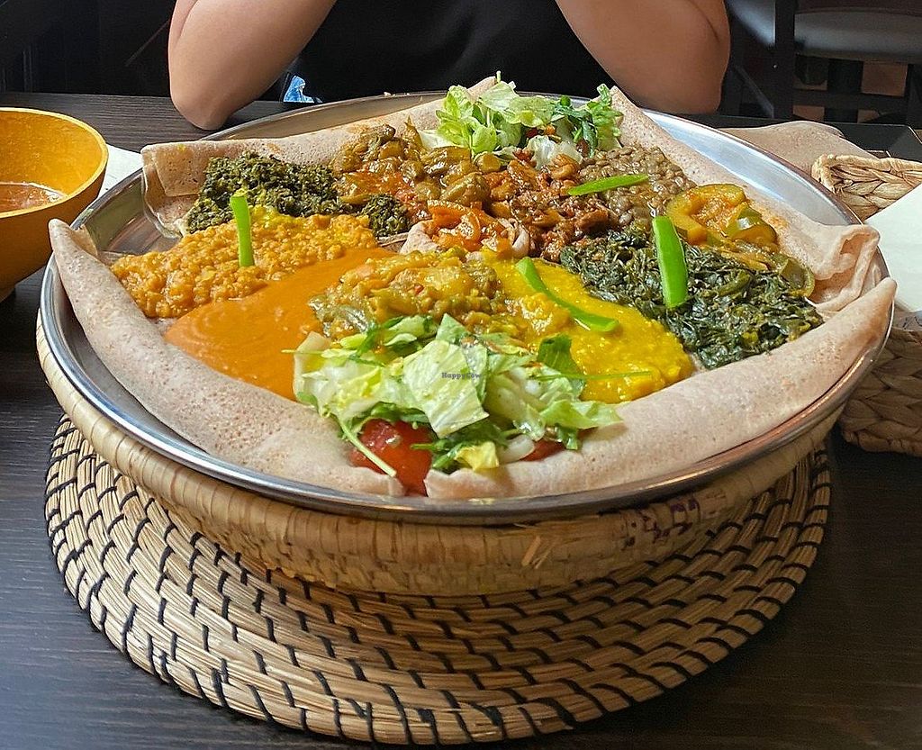 I shared the vegetarian sampling platter with a friend. We confirmed that it was automatically vegan. The injera was light and fresh, topped with a tasty selection of different types of stews. The staff was also very welcoming and friendly. I would give this place 5/5 if it would be possible.