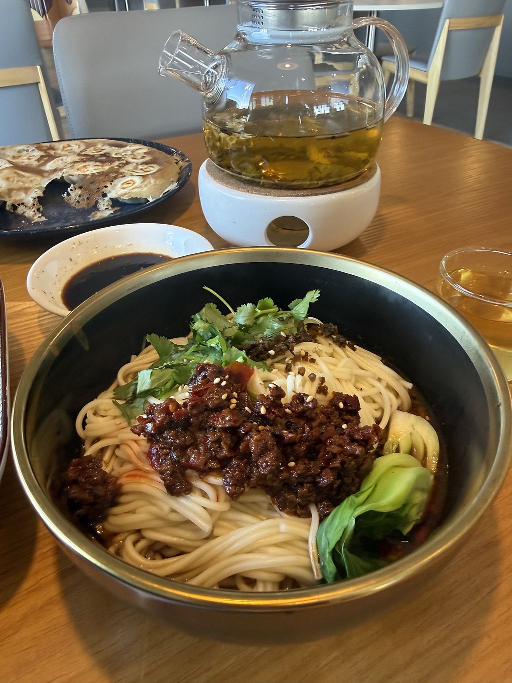 We ordered 4 dishes plus dessert and shared it. Everything is fully vegan and just incredible. It is not a hyperbole to say that their fresh dumplings were the best I have ever had in my life. The spicy is actually spicy, but/and they were very willing to adjust the spicy dishes for the non-spicy eater in our group (plus bring spicy chilly oil on the side). The dan dan noodles were great, and the mushroom hot plate was juicy and tender. We tried the lotus soup 'dessert' which was very nice - never had anything like it before.