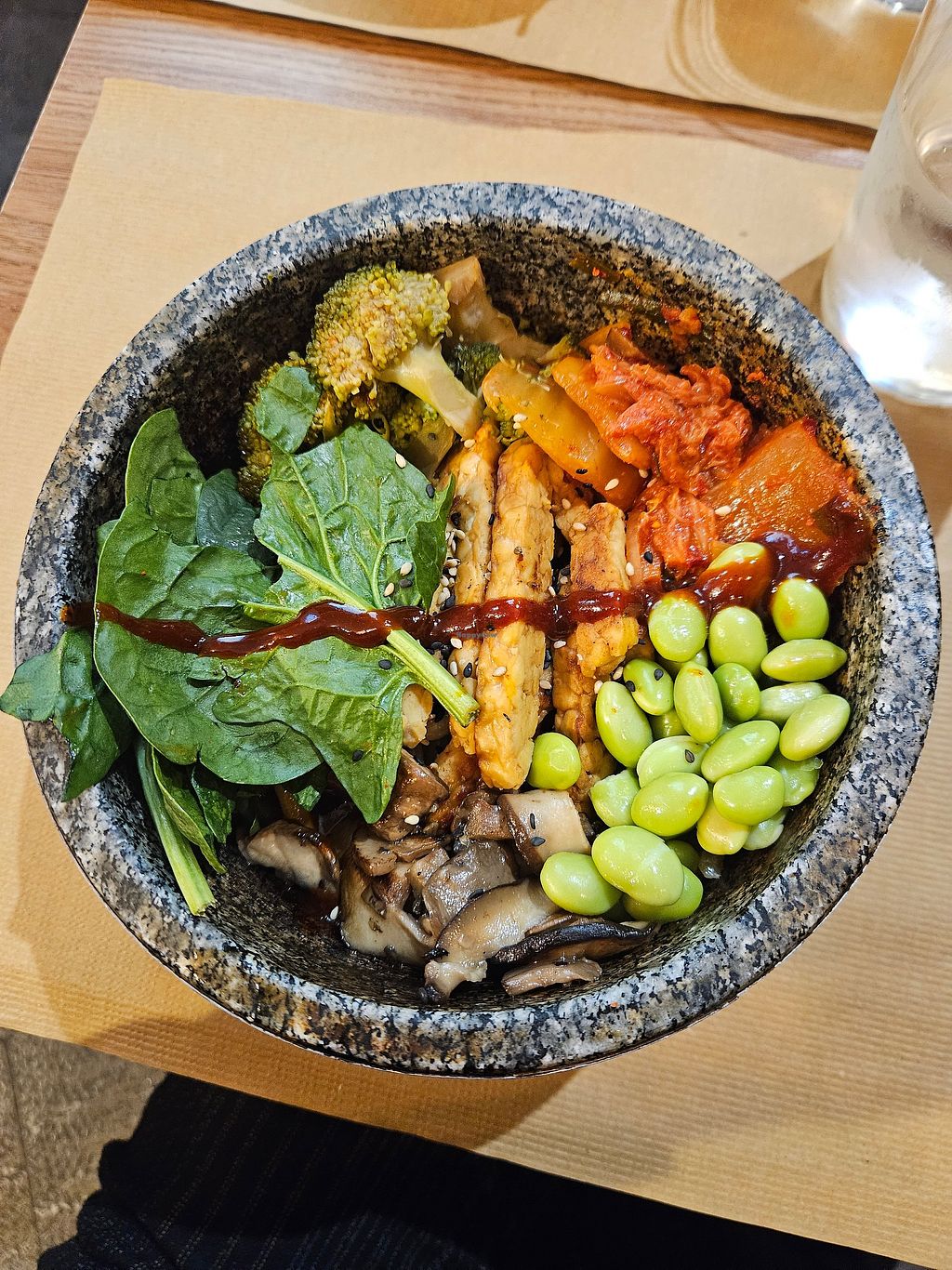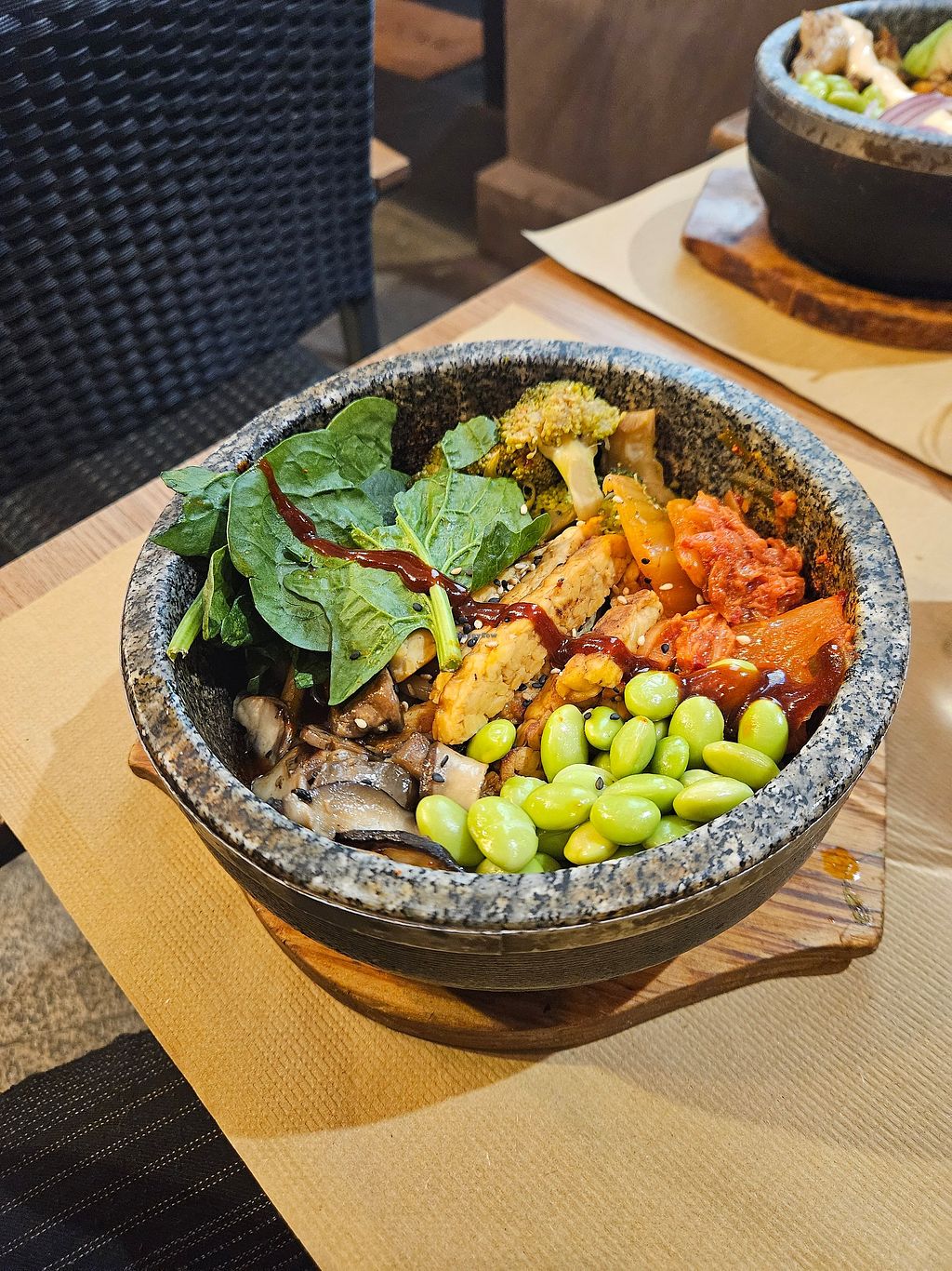 Vegan kimchibowl with tofu, vegetables and rice and kimchi