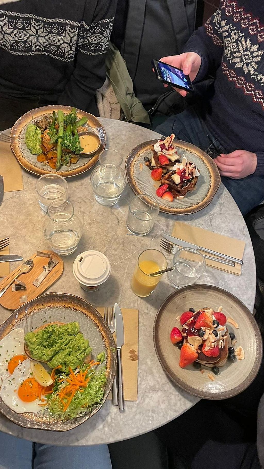 Kin hash (top left), waffles, pancakes, and avocado toast.