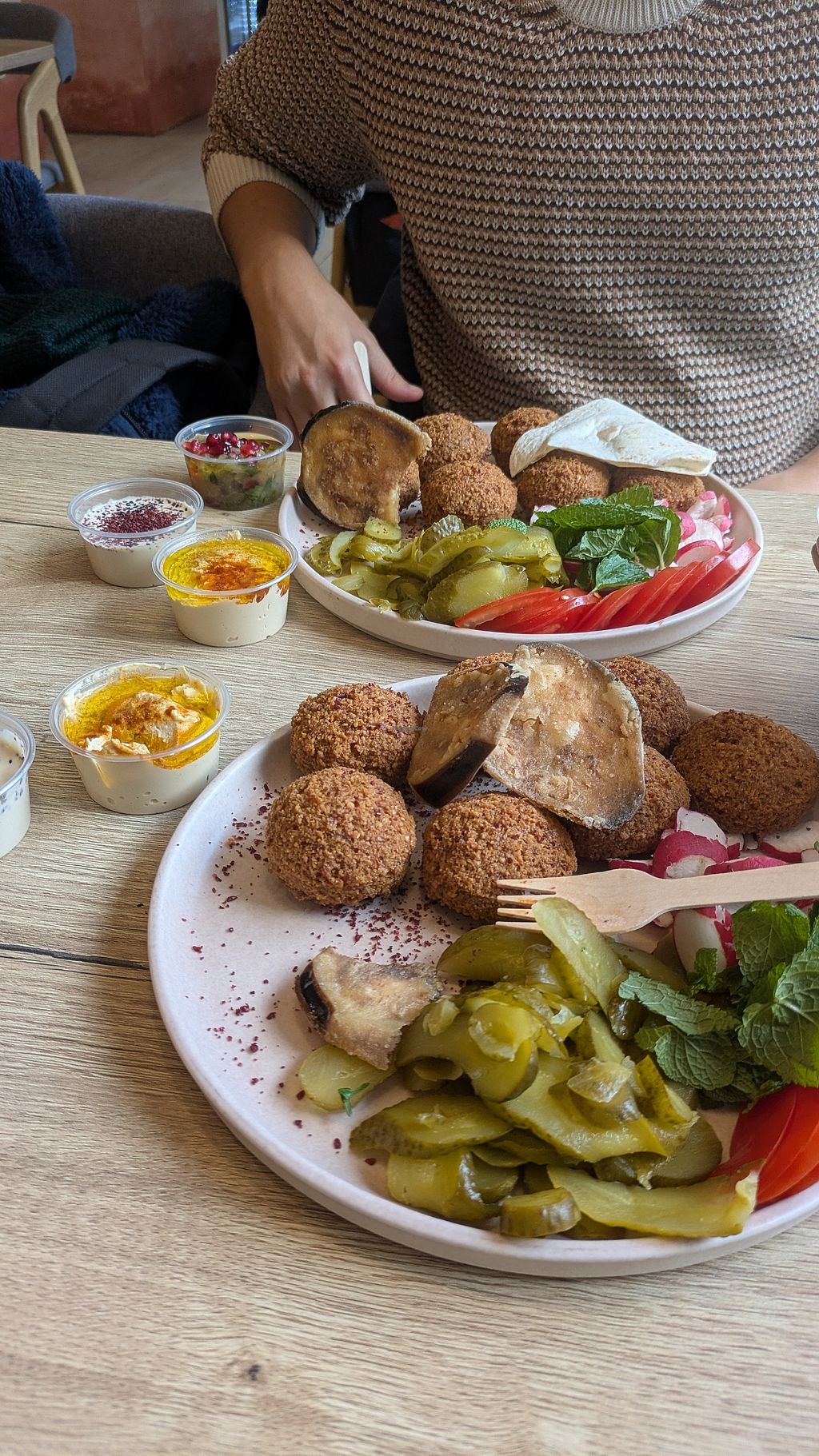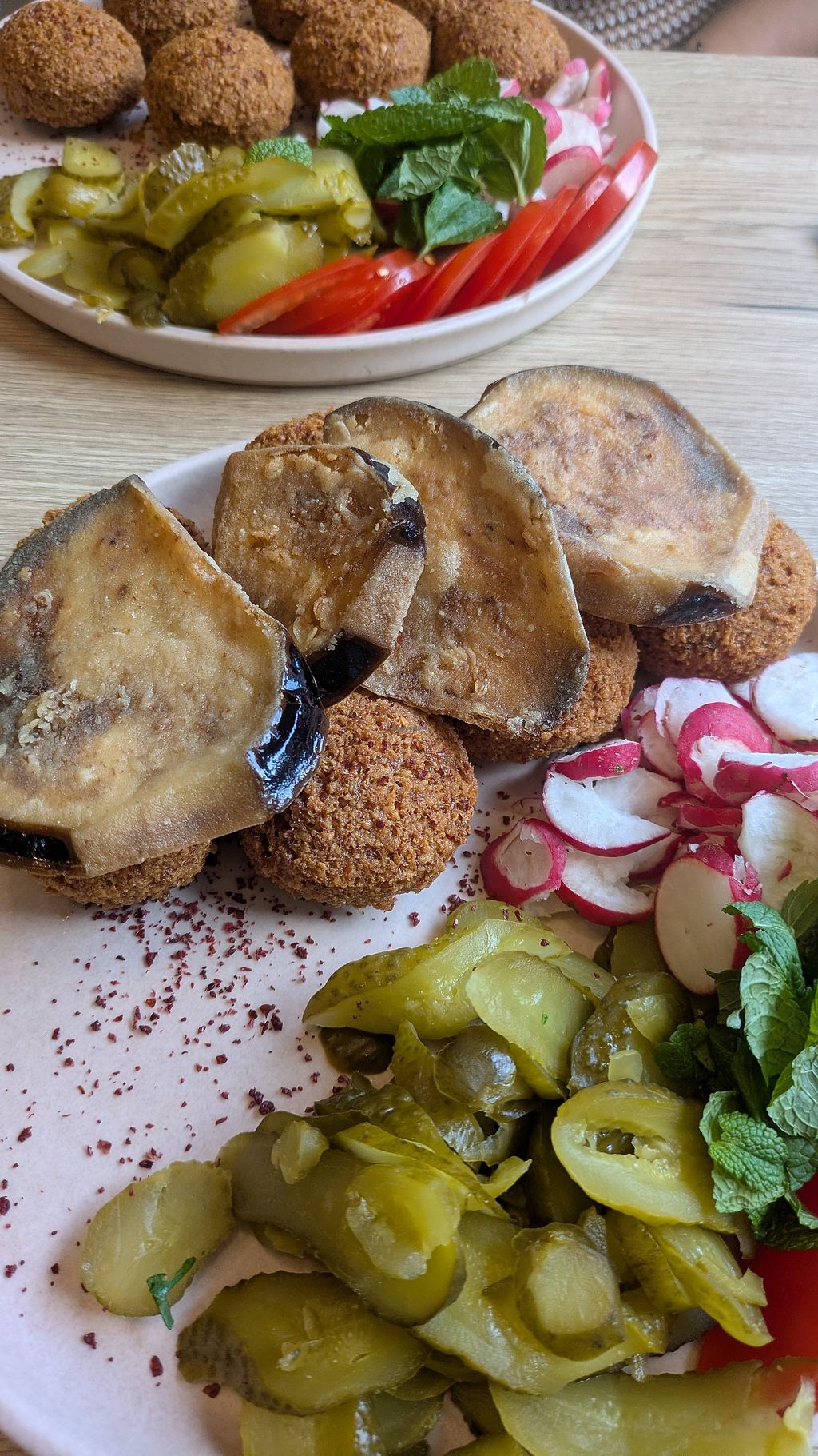 had the falafel plate which was very generous in size for a small price, especially considering we are in norway. the dish consisted of 5 or 6 big falafels, fries, fried aubergine, pickles, radish, tomatoes (i asked to omit these and it was no problem), mint, a couple of dips/sauces and flat bread.