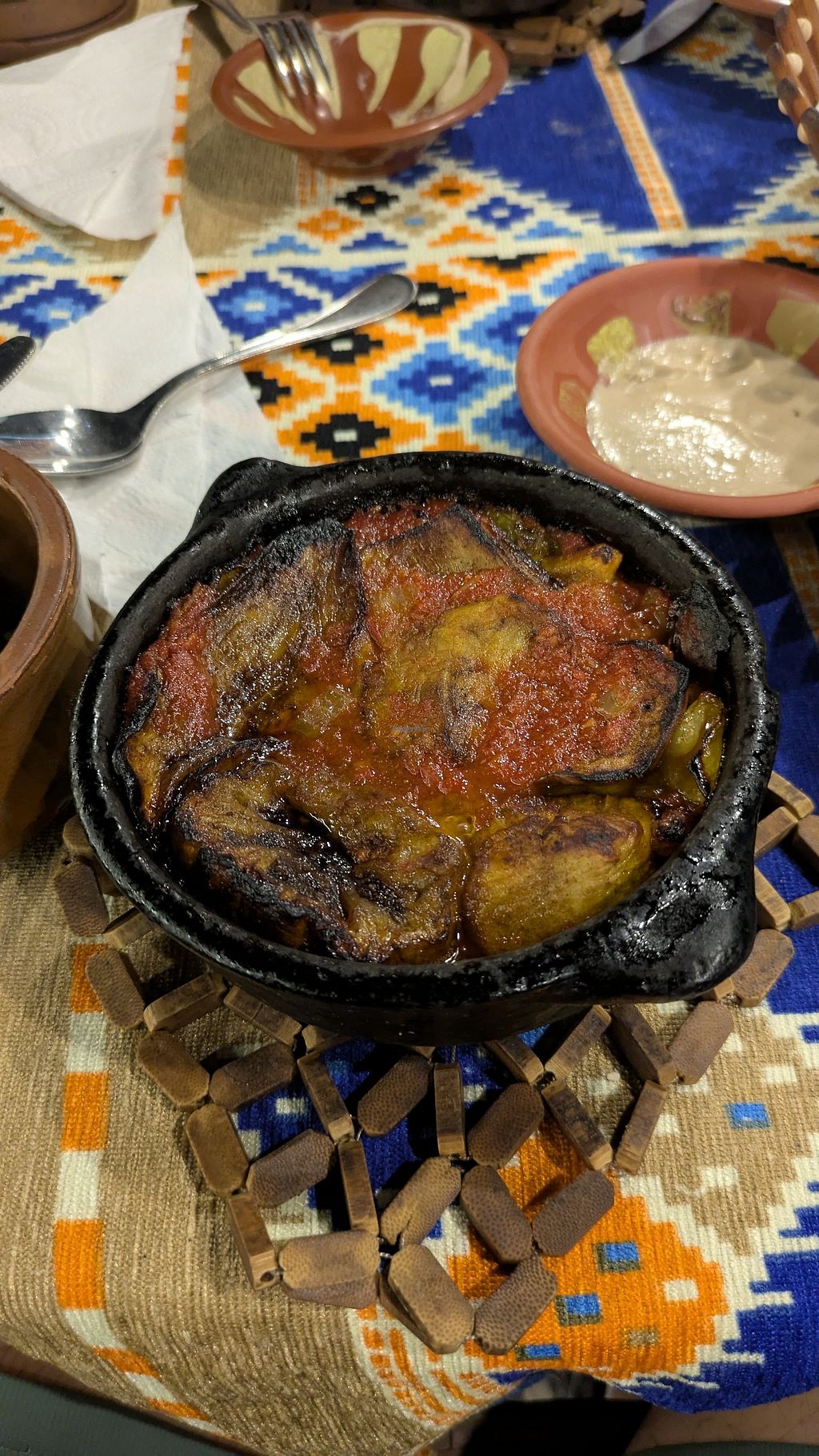We ordered the aubergine tagin without the bechamel (then they brought it with the bechamel so we asked them to fix it and they did it) and the vegetable tagine. Both came with rice, tahini, bread and salad. Food was excessively spicy for my liking.