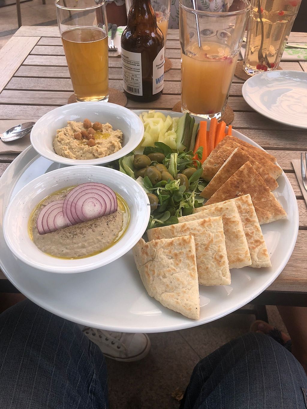 Homemade aubergine cream, humus, fresh vegetables, olives and pita.
