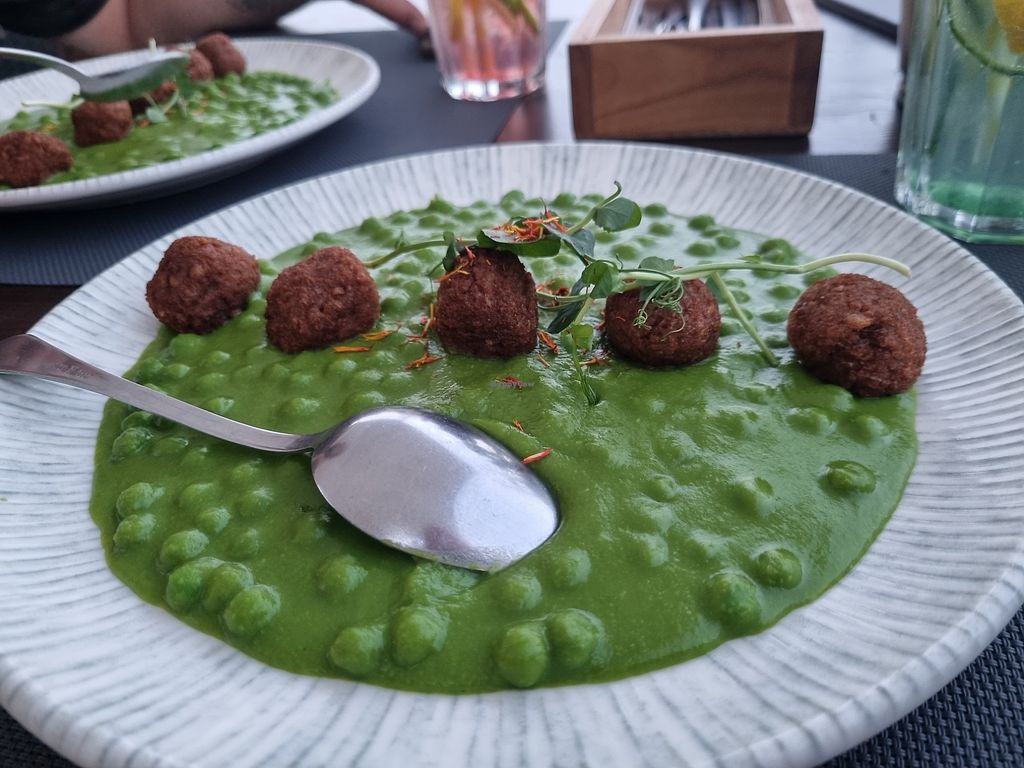Very few vegan options ; only 1 main (the pea puree with vegan meatballs) and 1 dessert. The main was very disappointing, it had not much taste, even though it’s hard to mess up a simple pea puree. It tasted very watered down, the meatballs were ok, not homemade. The portion was also very small, without any sides (which is usual in Hungary and included in all other mains), so even with an additionel side of rice I still felt hungry afterwards. After this I did not bother to try the dessert. I also found the final bill expensive for what it was. You’re basically paying for the view, which really is beautiful. Service was also good, but not a personal or particularly welcoming atmophere.