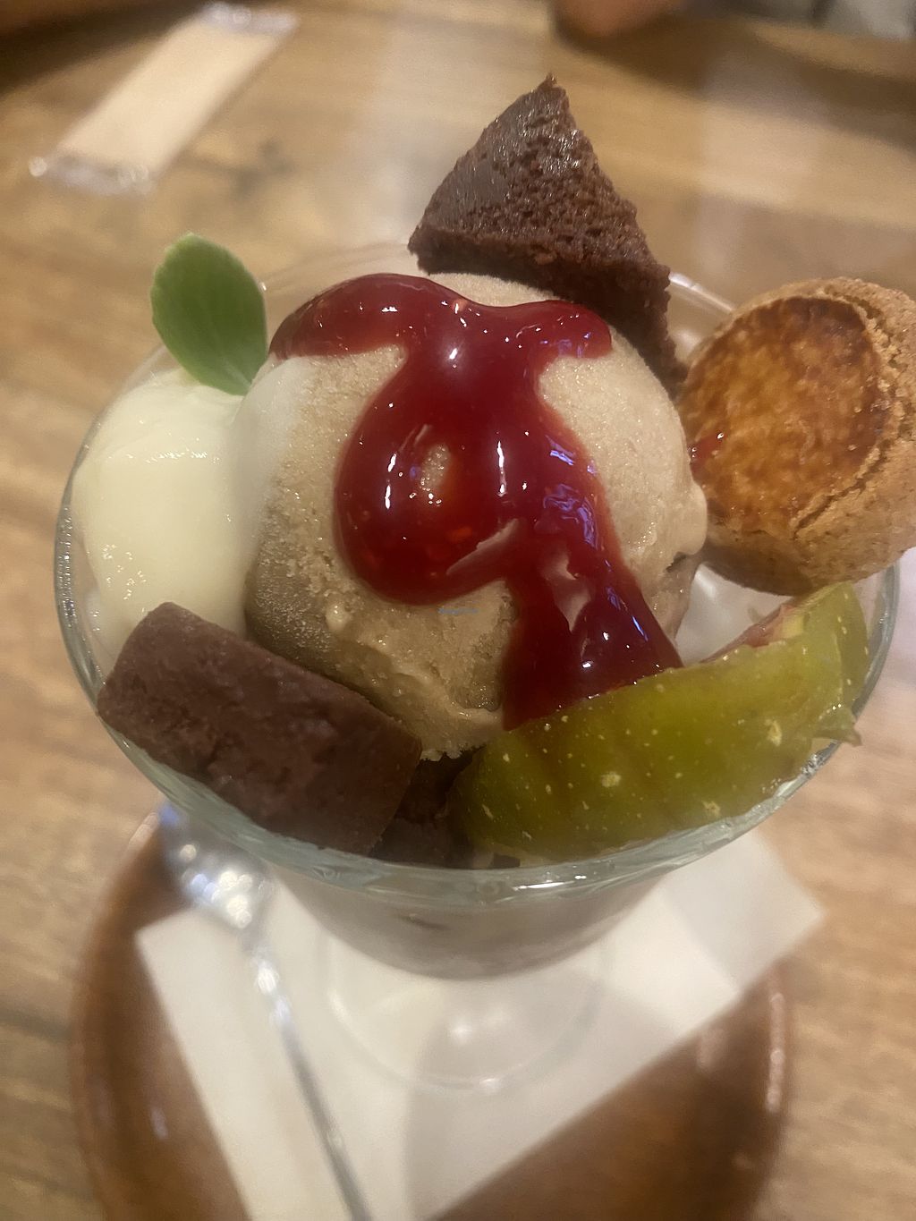 お米は合鴨農法で鴨を利用して栽培されたお米です。飼育を終えた鴨はその後、肉となってしまうのでヴィーガンではありません。お米が使われていないバーガーやスイーツはヴィーガンです。ヴィーガンケーキとヴィーガンアイスクリームが美味しかったです。