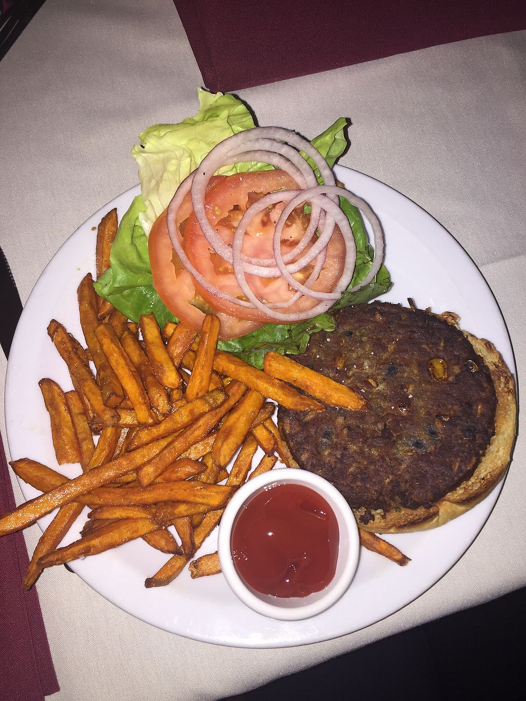 Vegan black bean burger with sweet potato fries