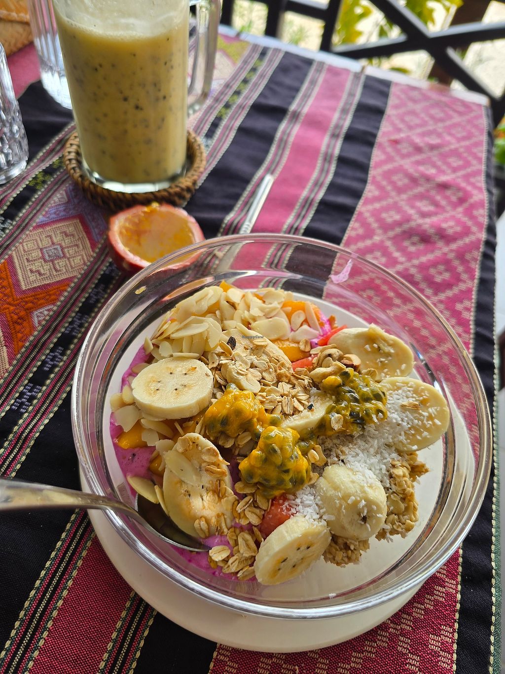 We ate breakfast and dinner here as a birthday treat as its a little more expensive (>100,000LAK pp) than what we'd been paying. Overnight oats smoothie bowl was beautiful and bhudda bowl also delicious! Both dishes had so much variety of fruit and vegetables. Plenty of vegetarian options and more meat options for my partner. Free purified drinking water too!