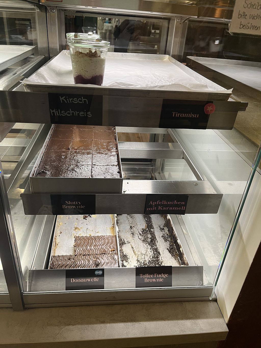 Ok this title is a bit misleading, as this cake store is specialised in baked goods WITHOUT white refined sugar. Staff was absolutely lovely and gave us great advice. We had the slutty brownie (I think), absolutely amazing if you love dense, thick and filling chocolate bombs (I esp. loved the cookie crust on the bottom), but the rhubarb crumble was almost even better, the pudding layer was to die for. Both cakes cost less than 8 €, imho absolutely worth it.