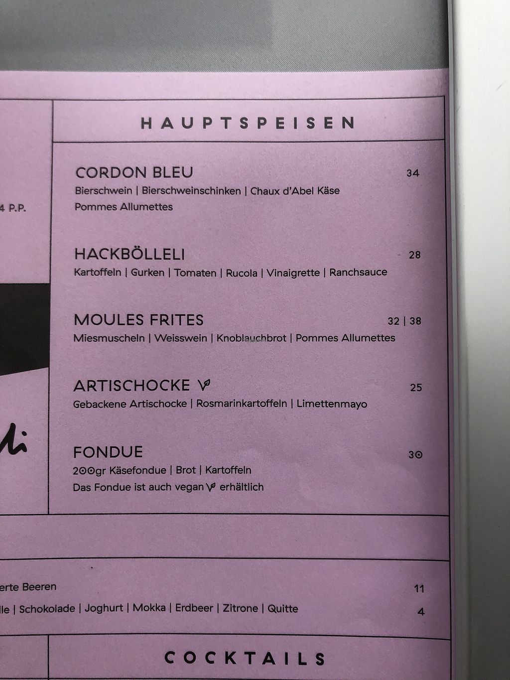 Serves meat, vegan options available. Restaurant and bar with a small menu, including two vegan main courses. Vegan options include a vegan cheese fondue with bread and potatoes. Other vegan options may be available - ask your server. Reported closed October 2022.