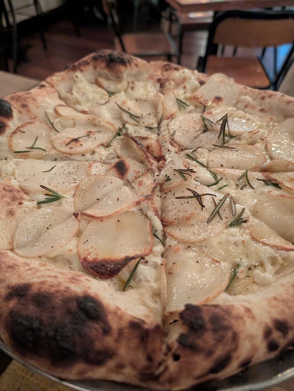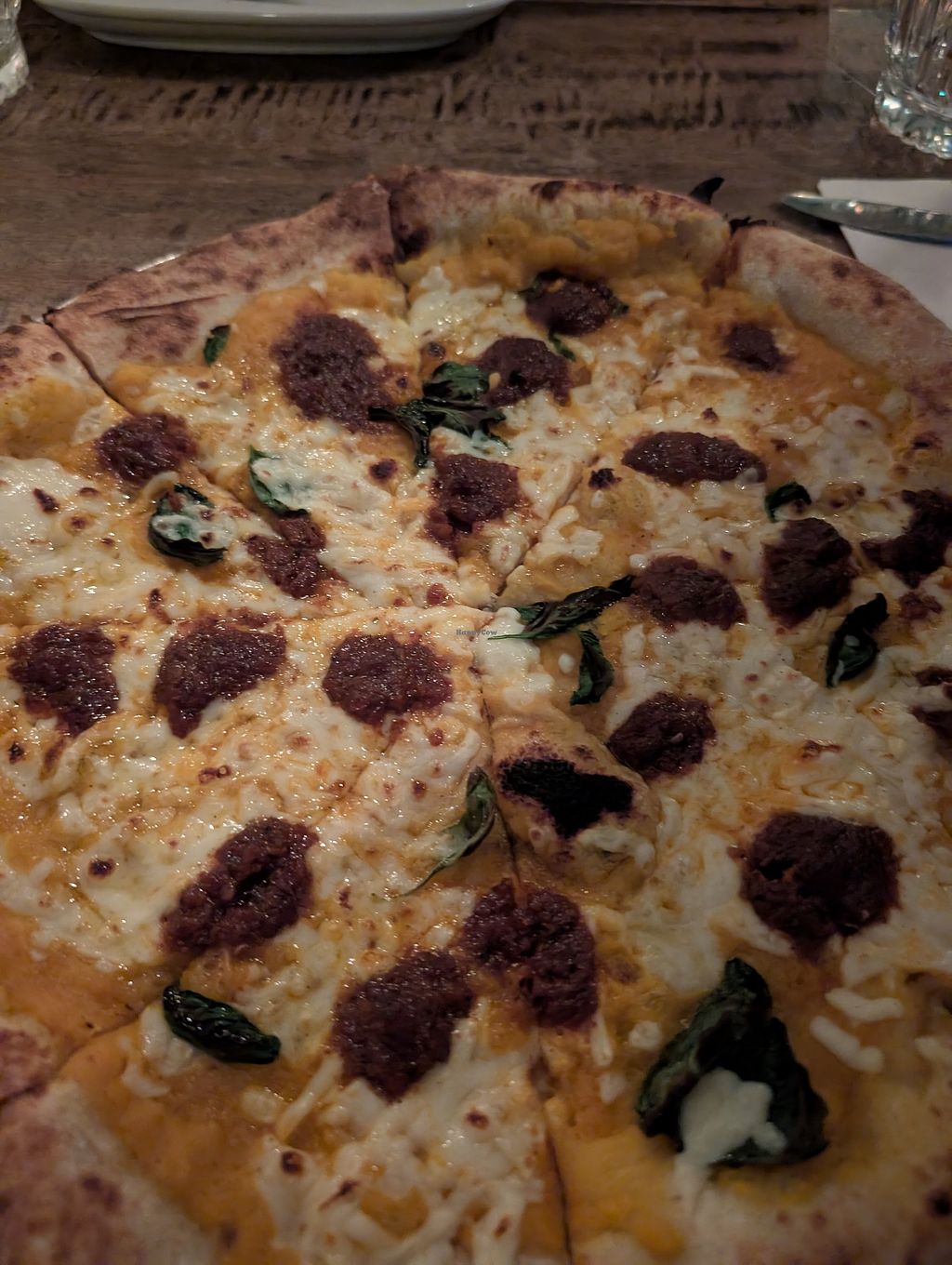 Pumpkin pizza without tallegio and pecorino, sub vegan cheese, a creamy delicate vegan option with a vegan Nduja which was delightful.