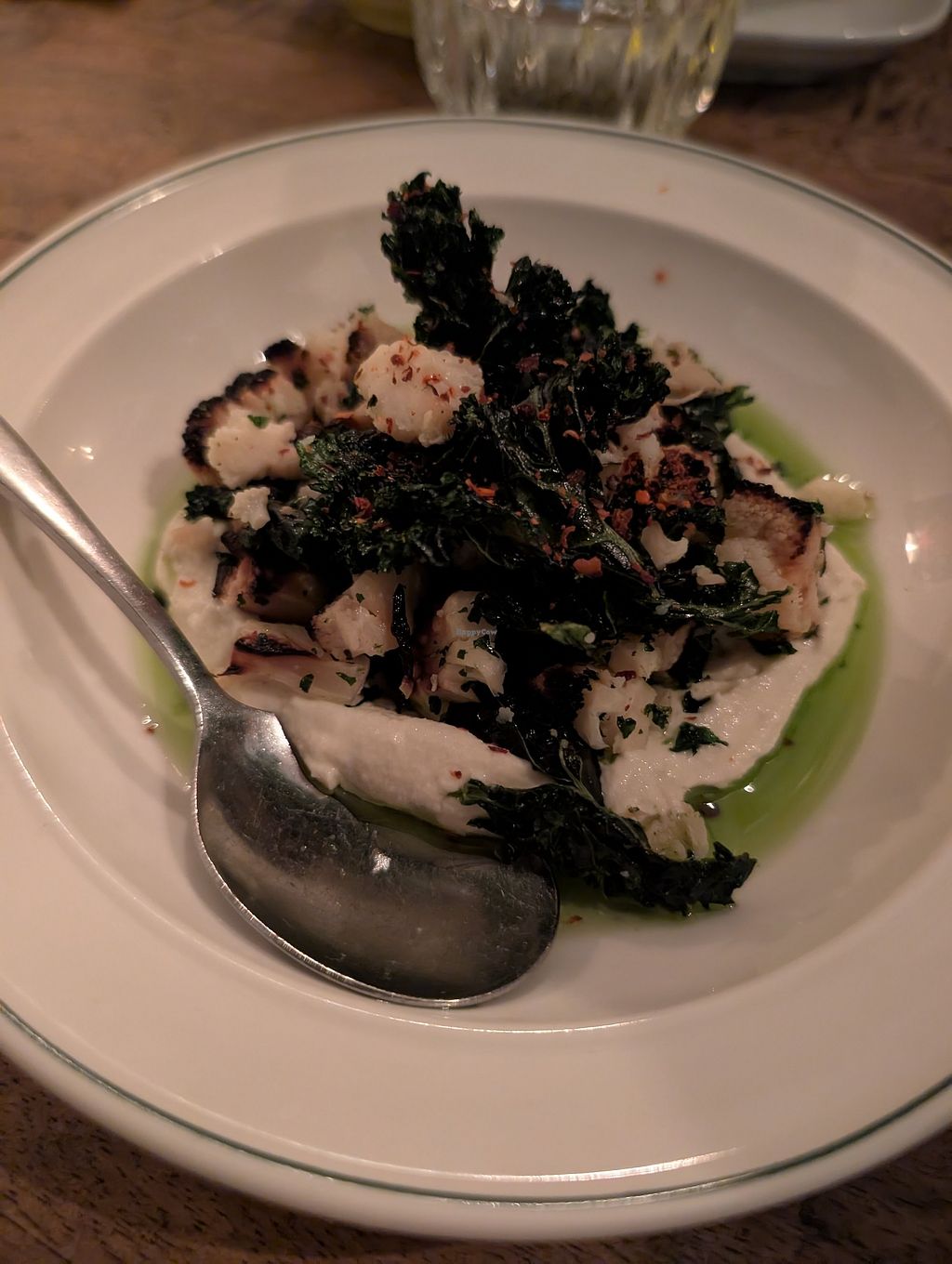 Read moreAlmond ricotta baked cauliflower, Fried kale, allepo pepper.