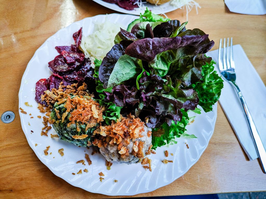 This place is incredibly good. There are only a few choices, but one or two vegan options are always available. You can choose 2, 3, 4, or 5 dumplings -- and whichever you choose, you get a plate piled high with salads, which are all delicious. The vegan options are so good. I can eat a lot, but I usually get the 2-dumpling plate, with whichever vegan options are available, and I'm always happy afterwards. The environment is old-school-Berlin funky -- very comfortable. And the staff are friendly and helpful.