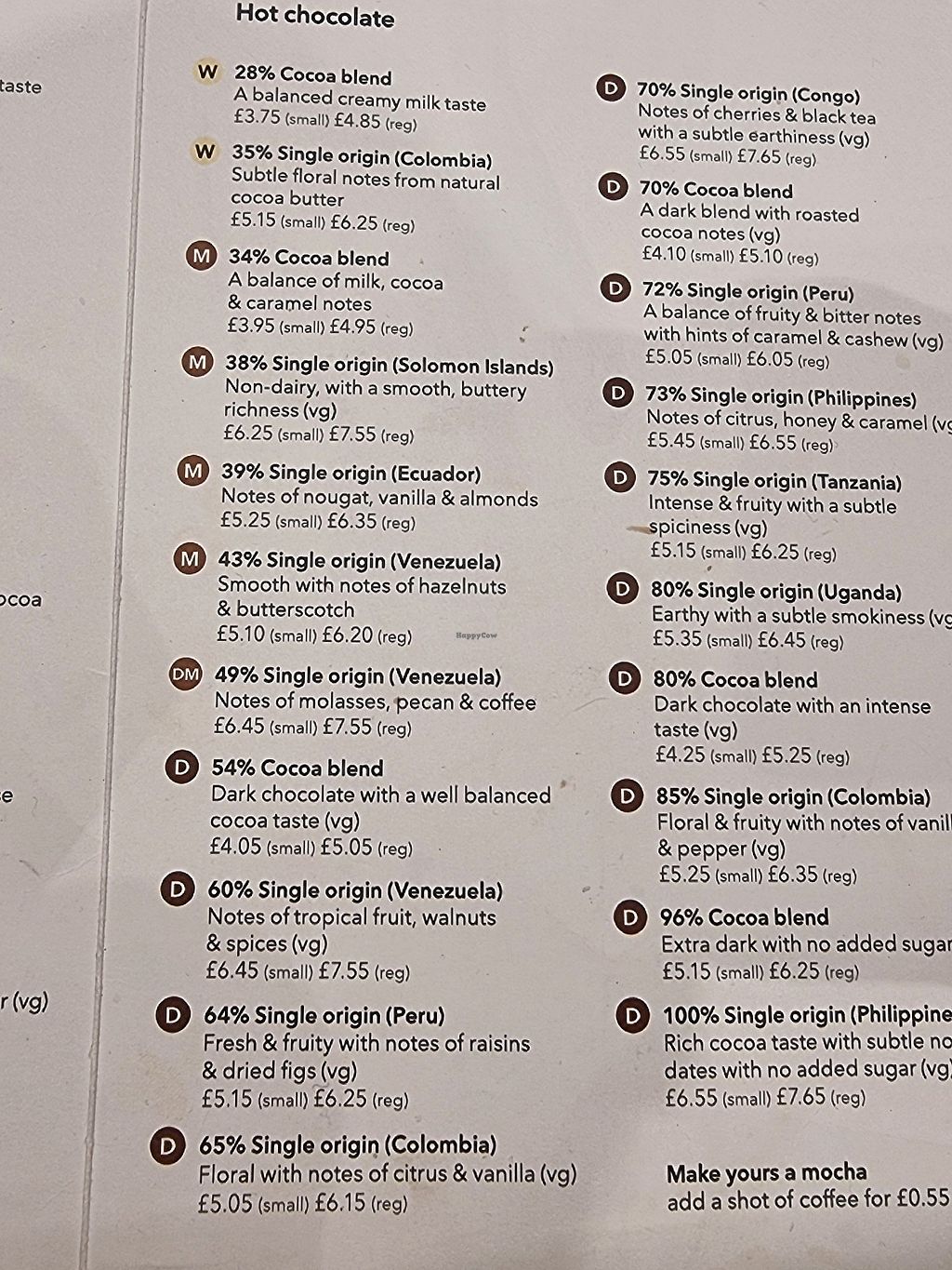 Many different plant milks available and each hot chocolate is labelled whether it is vegan or contains milk. I love the iced chocolate drink, and the vegan chocolate is really tasty!!