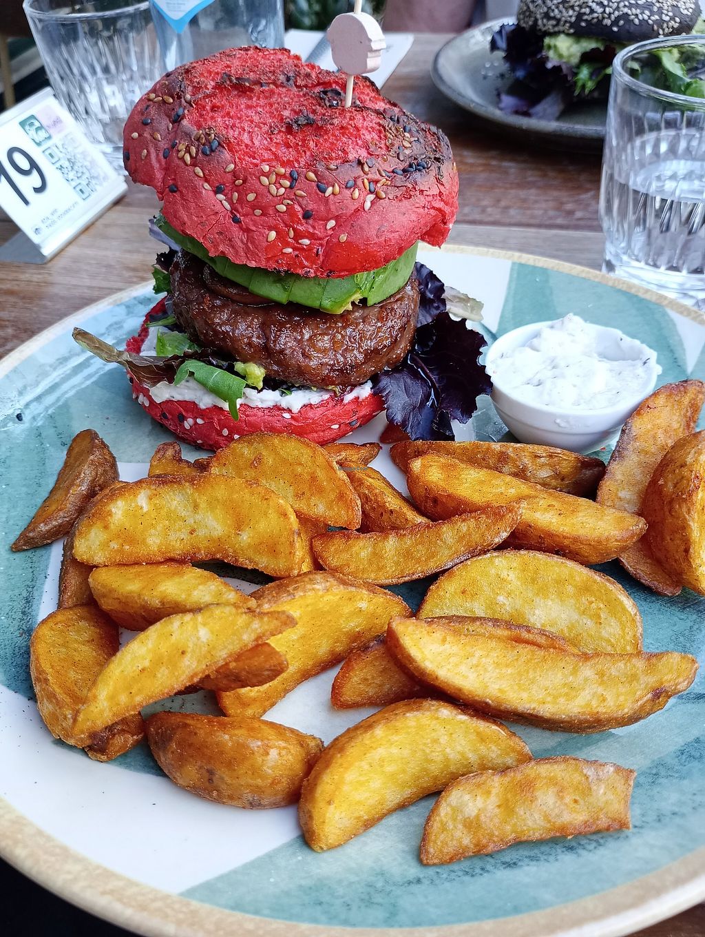 Relaxed, contemporary, lunchtime vibes at this restaurant off the main tourist streets. We had the beyond meat burger which was pretty good, (with an unexpected but welcome big chunk of avocado) and a rye bagel with avocado, beetroot, eggplant.