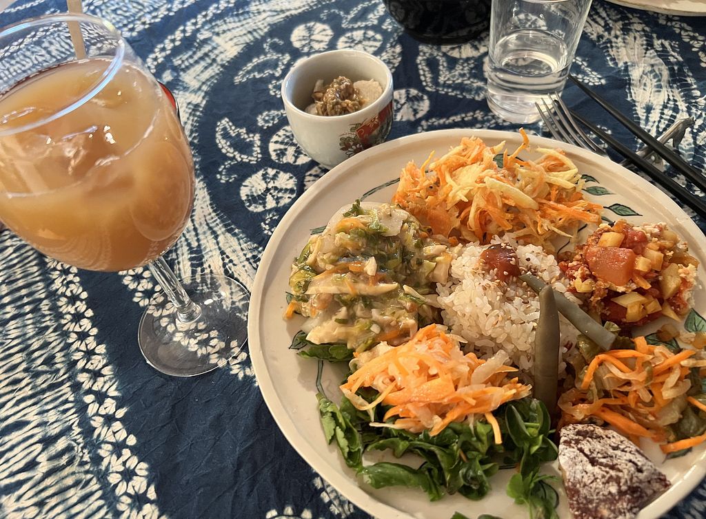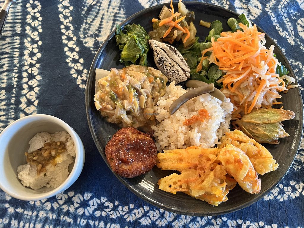 Gemischte Platte mit warmen und kalten Speisen sowie gepickeltem Gemüs…