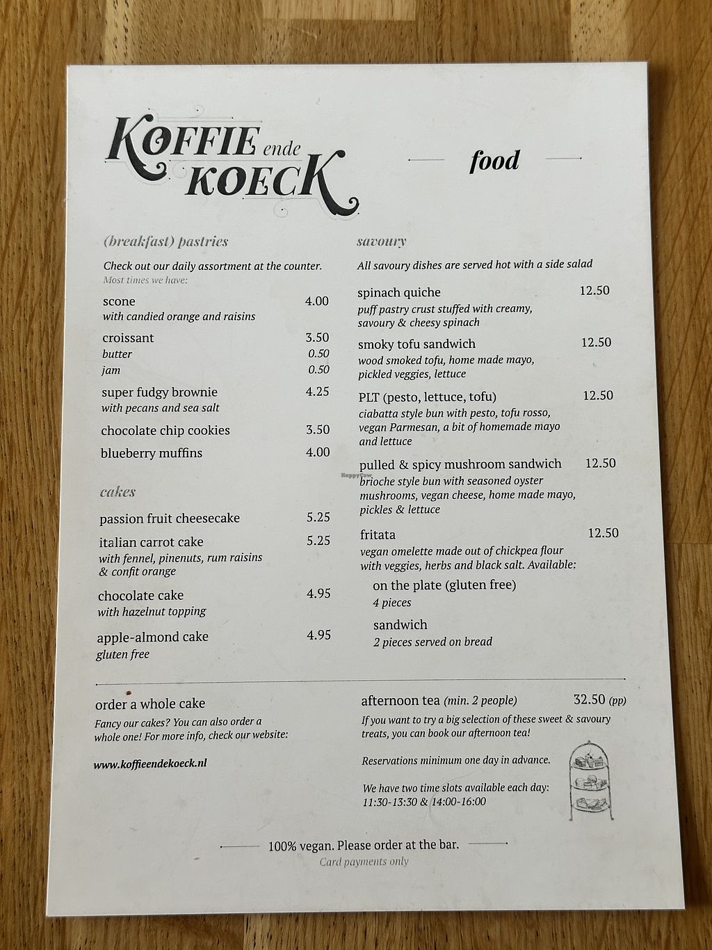 Cafe offering breakfast and lunch, and sweets in the afternoon (cinnamon rolls, muffins, brownies). Since 2014. High tea is available on request with reservation only. Email contact@koffieendekoeck.nl. Open Wed-Sun 10:00-17:00.