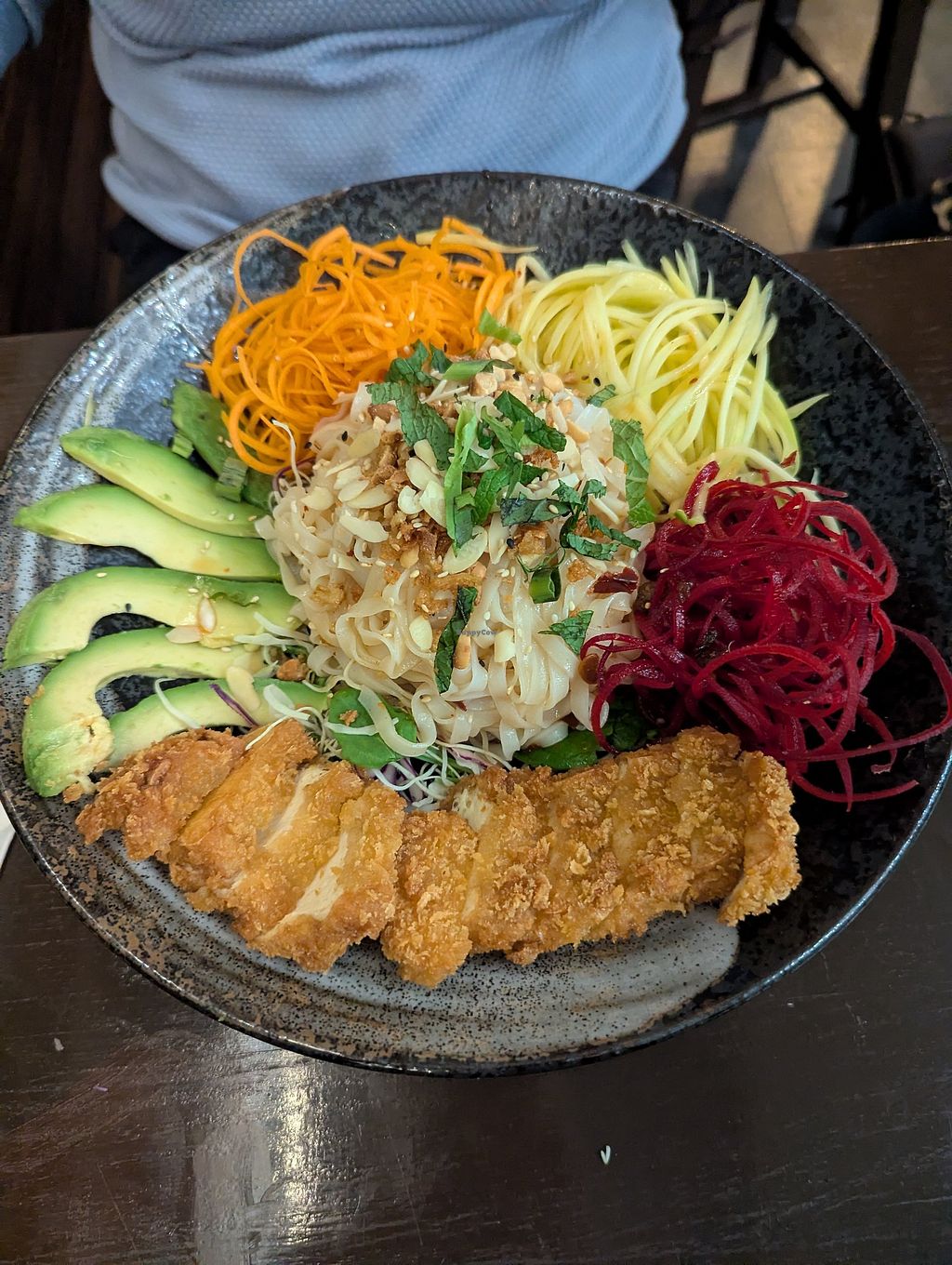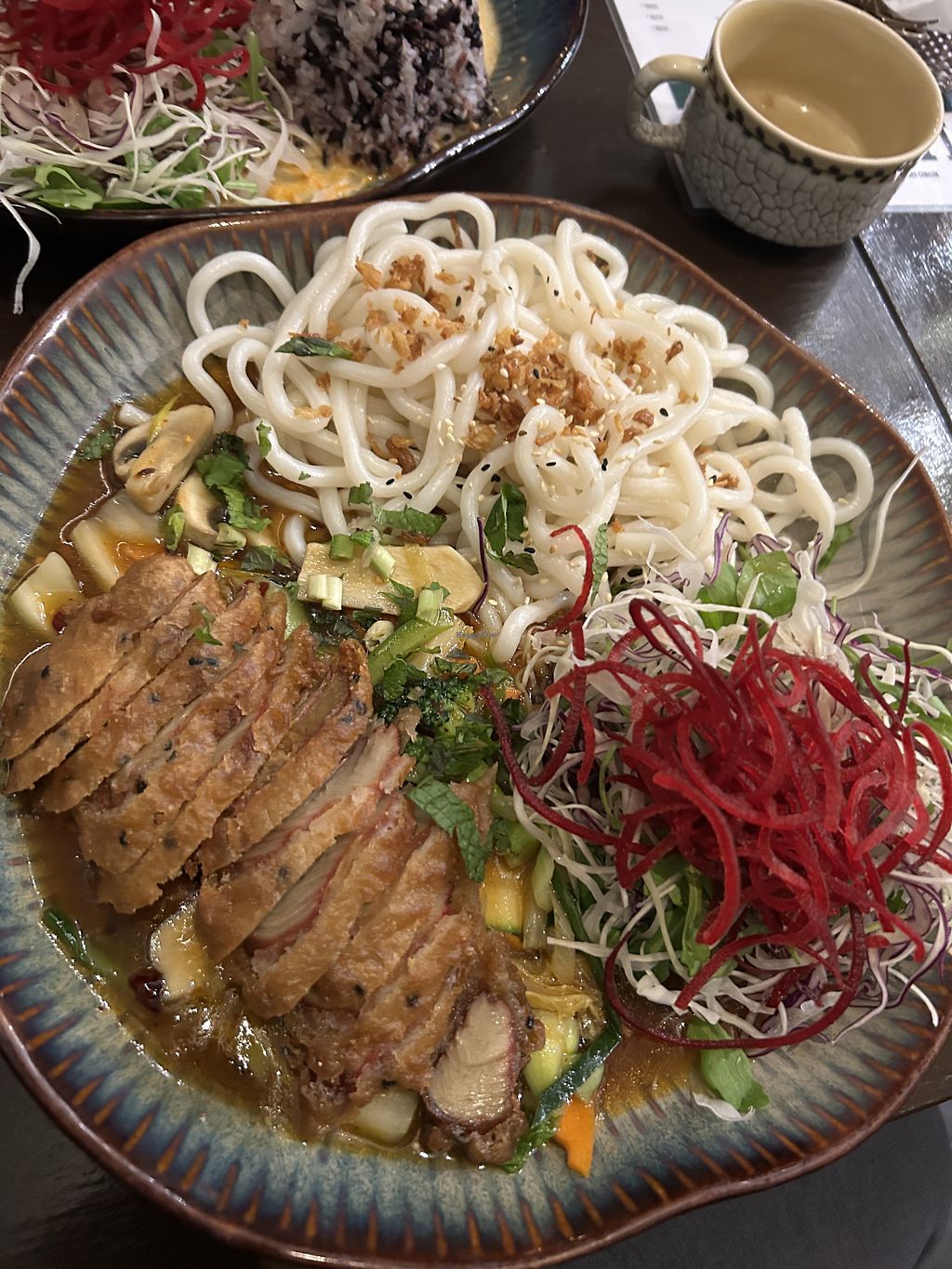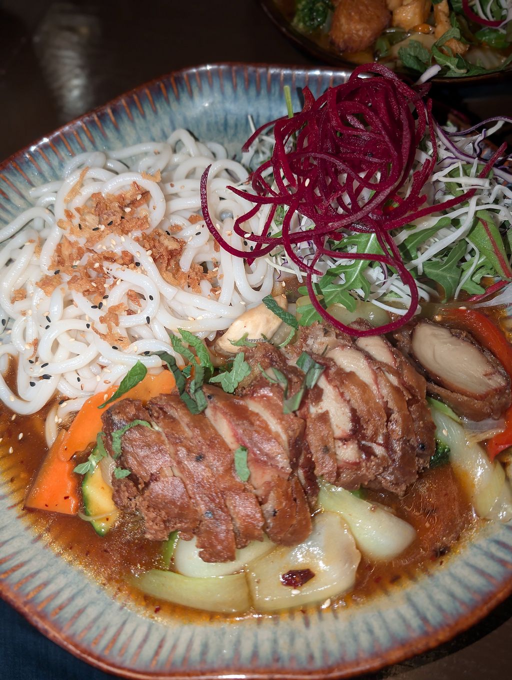 Vegetable bowl and peanut bowl, both with crispy “duck”