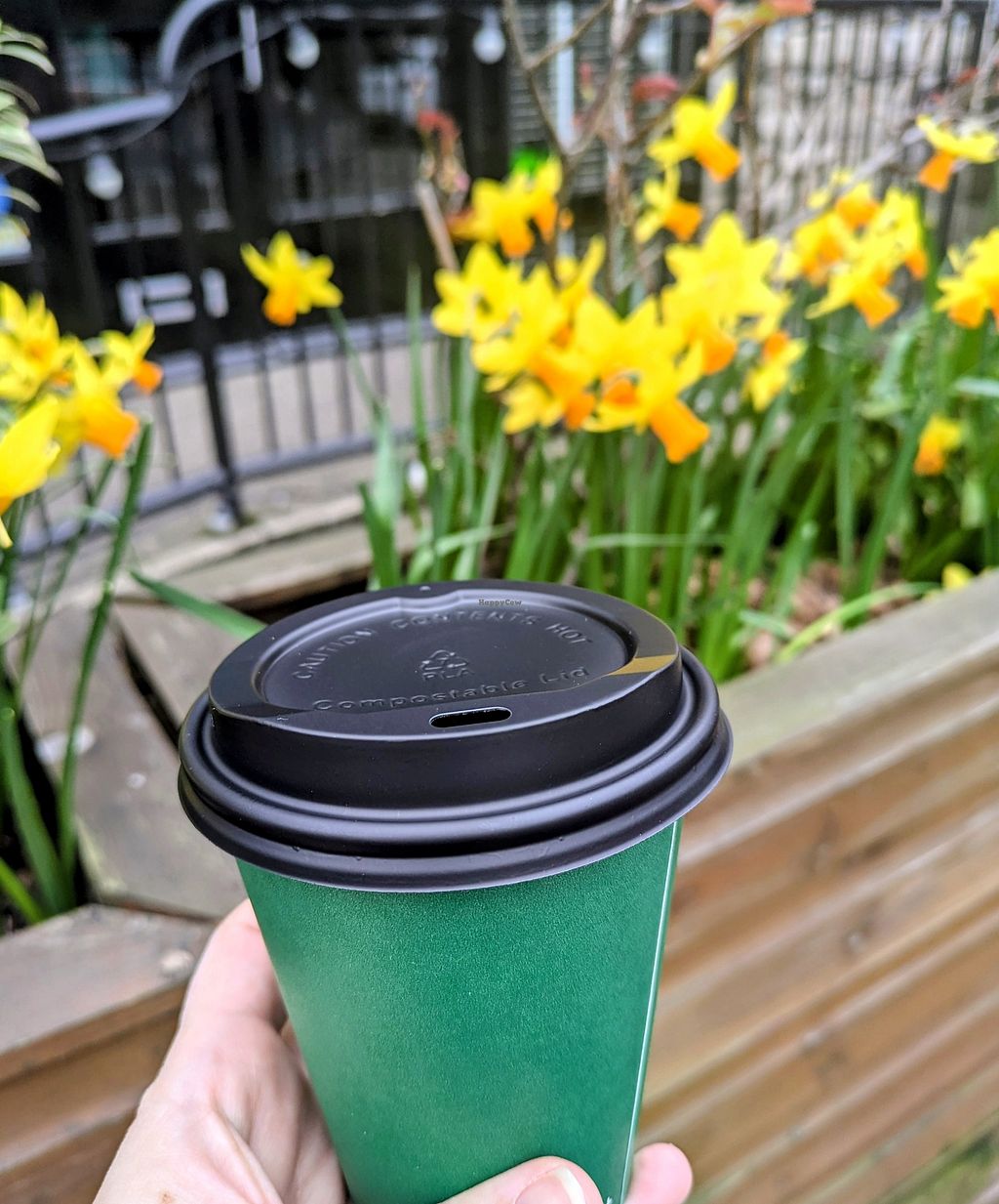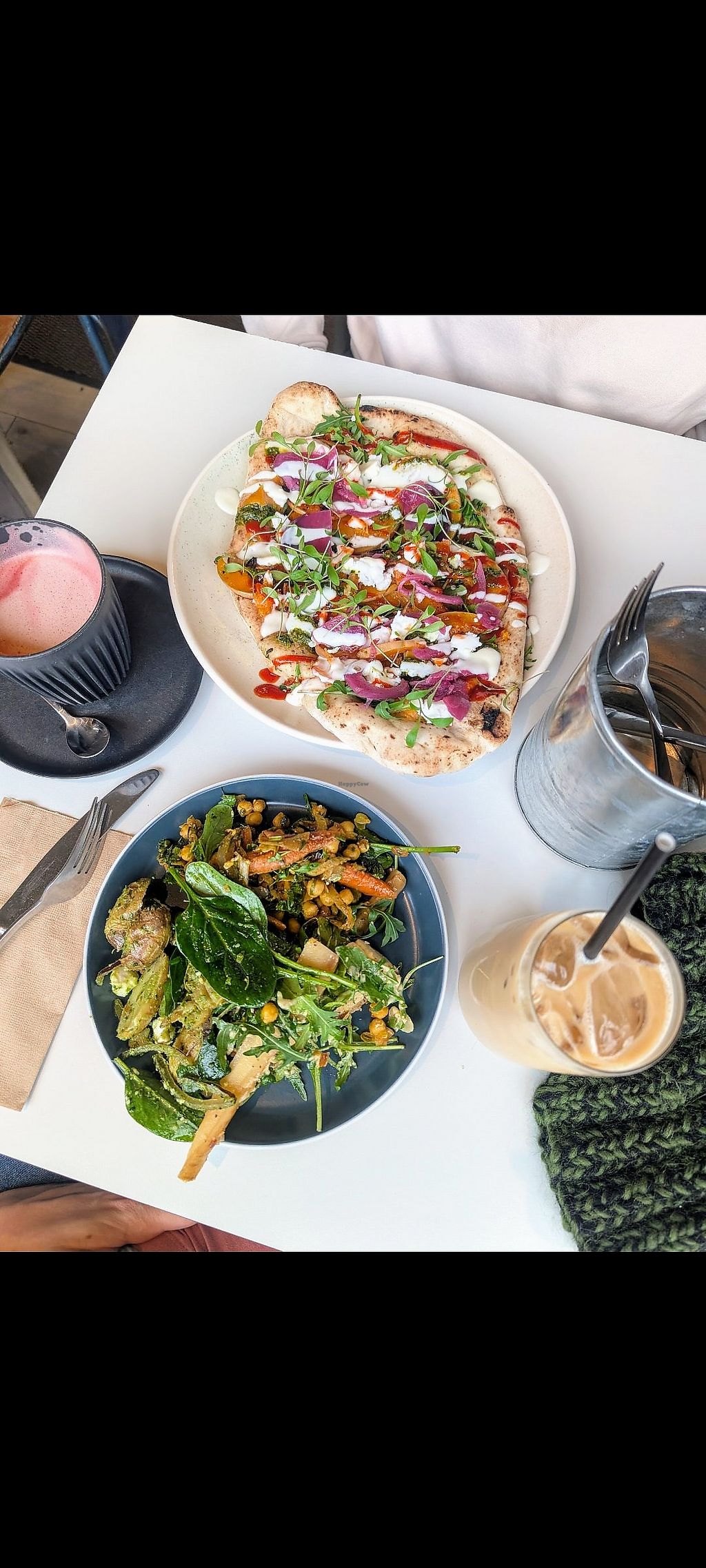 Mixed plate of salads, flatbread, iced latte and a beetroot latte