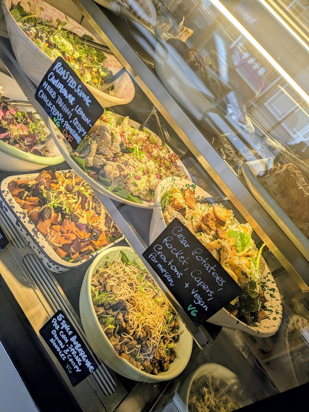 Loaded flatbread, the brioche and cauliflower and spinach salad