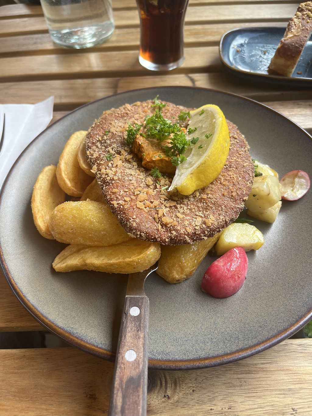 Great Schnitzel-Like Seitan. But be cautious: They might give you a complementary non vegan bread with cheese as a starter.