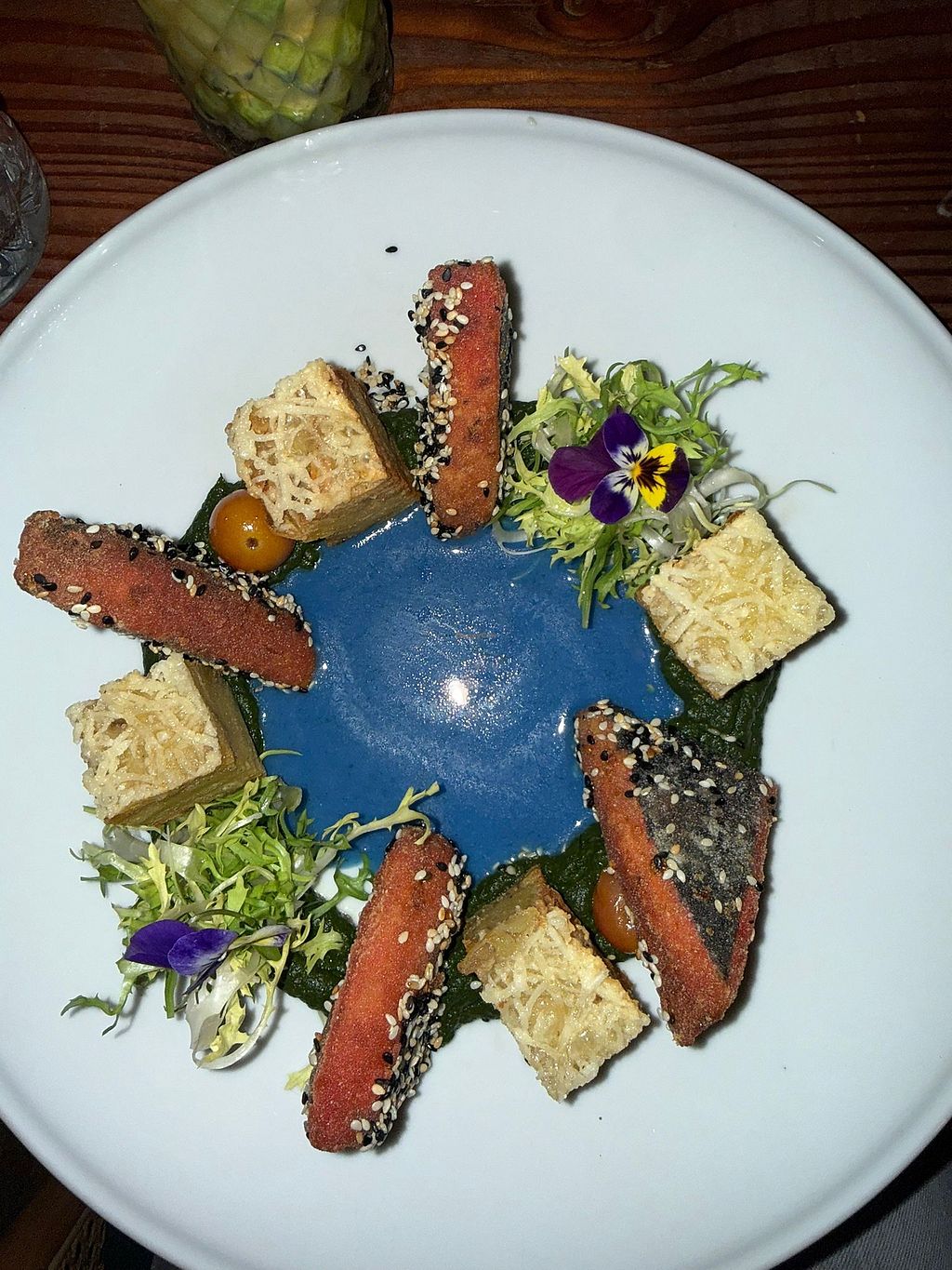 All the dishes were a flavor bomb. The tofu 'salmon' dish is beautifully presented, as is the pistachio dessert topped with gold leaf. That dessert was very, very small and arguably overpriced for what it was, but so good!