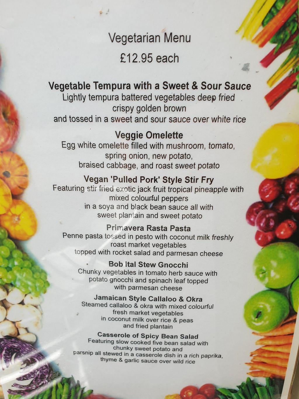 Serves meat, vegan options available. Jamaican food menu, includes various vegetable dishes such as butternut squash risotto, Jamaican callaloo & okra, ital stew gnocchi, spicy bean casserole. Ask which items are or can be vegan. Reported closed July 2022.
